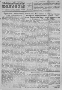 Пр олет ар и и всех стран, соединяйт есь ъ а Ш ш Ш т Ж м КОЛХОЗЫ О р г а н С е в е р н о г о P H В К П ( б ) и р а й с о в е т а д е п у т а т о в т р у д я щ и х с я Н о в о с и б и р с к о й о б л а с т и Дл я успешного разрешения задач пятилетнего плана в области сельского хозяйства первостепенное значение имеет дальнейшее организационнохозяйственное укрепление колхозов и повышение уровня большевистского руководства к о л х о з а м и. П Я Т Н И Ц А 2 7 С Е Н Т Я Б Р Я 1 9 4 6 г . № 4 8 ( 8 7 7 ) Цена. 15 к о в . П о к о н ч и т ь с н а р у ш е н и е м У с т а в а с е л ь х о з а р т е л и У с та в сельскохозяйственной а р те л и — освовнои, высший з а к о н колхозной ж и з н и . В этом в а ж нейшем ярограммном документе воплощена мудрая с т а л и н с к а я н о л и т п к а о р г а н и з а ц и и и у п р а в л е н и я колхозами. «Большевистское руководство колхозами в том и состоит, чтобы п е у к л о п н о п р а к т и ч е с к и воплощать в ж и з н ь статьи этого основного, высшего закона колхозной жали в . (« П р а в да»), Именно с т а л и в с к н и У с та в сельхозартели обеспечил н е у кл он ный подъем всех отраслей сельско го хо зя йств а , рост з а ж и т о ч ности к о л ю з н и к о в . Успешное решение задач новой сталинской п я т и л е т к е в области сельского хо зяйства требует дальнейшего ор ганизационно - хо зя йст кея н о го у кре п л ен ия колхозов, повышения уровня большевистского руководства колхозами. В связи с этим важнейшее значение имеет постановление Совета Министров СССР и Ц К В КП (б ) «О мерах по ликви даци и н аруш ения У става сельскохозяйственной артели в колх озах». Со вет Министров СССР и Ц К Ь К П (4 ) установили наличие серьезных нарушений Устава сельхозартели в колх о зах Надо со всей прямотой за я в и т ь , ч т о в ряде колхозов нашего района имеются факты грубейшего наруш е ни я Устава сельхозартели. Во многих к о л х о з а х чрезмерно раздуты ш та ты уп равленческого и обслуживающе го персонала, на к о т о рые расходуется большое коли чество трудодней и денежных средств. В 1 9 4 5 г оду , например , на у п ра вленческо-администра тив ные ш т а т ы израсходовано 12 проц. всех трудодней. В колхозе «Красный коммунар» на эти цели израсходовано 2 5 проц. т р у додней, «Осоавеахим» — 2 2 , «Новый п у т ь » — 2 0 , «Советская Сиб и р ь »— 2 2 проц. За счет т р у додней во всех сельсоветах содерж а т с я с е льислолпитсдп , а в кол хозе « К р ас ны й Октябрь* у ж е не один год начисляют трудодни деж у р н о м у сельсовета Волковой. Все это приводит к с н иж е нию доходов колхозов ж колхозников. С подобной п р а к т и к о й надо решительно п о к о н ч и т ь . Известно, что земла з а к р е п ляется за колхозами навечно и является источн ико м кре по с ти к о л х о з н о г о строя. СНК СССР и Ц К В Е Щ б ) в своем постановлен и и о т 27 мая 1 9 39 г . предуп ре ж д а л и с тро го оберегать к о л хозные земли от разбазарлнапия. Однако многие руководители колхозов и сельсоветов забыли это постановление. Факты разбазарив а н и я колх о зны х земель в нашем районе приобрали массовый х а р а к т е р . Под видом подсобных хозяй ств рабочих п с л у ж а щ и х в в колхозе и м . Тельмана разбазарены д е с я т к и г е к т а р о в лу чшей п а - хотосвособной земли. Промартель «Тартасс», госбанк под видом подсобного хо зяйства засеяли на колхозной земле несколько г е к таров овса , гороха и др, к у л ь т у р , у рожай с ко торы х распределяется между со трудниками. Нод видом и нд ив и ду аль ны х огородов рабочих и слу жа