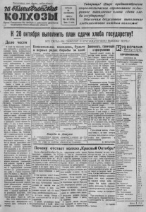 П р о л е т а р и и всех С ^ а н , соединяйтесь 1 заШшеёияШЫ колхозы О рган С е в е р н о г о РК ВНП (б) и райсовета депутатов трудящихся Новосибирской области С Р Е Д А 16 ОКТЯБРЯ 1 9 4 6 г . № 5 0 ( 8 7 9 ) Ц о н а 15 к о п . Товарищи! Шире предоктябрьское социалистическое соревнование за досрочное выполнение плана сдачи х л е ба государству! Обеспечим безусловное выполнение хлебозаготовок каждым колхозом ! К 20 окятбрявыполнить план сдачи хлеба государству! Д ело чести В о твет н а обращение а л т а й с к и х хлеборобов о досрочном в ы полнении п л а н а хлебозаготовок колхозники ва ш е г о ра йона в к л ю чили сь в предоктябрьское с о ц и а л и с т и ч е с к о е соревнование н в з я ли обяза тельство к 2 0 о к т я б р я з а в е р ш и т ь в ы п ол н ен ие годового п л а н а хлебозаготовок и сдать сверх п л а в а б т ы с . пудов зерва. П ередовые к олхозы с честью в ы п о л н я ю т это свое обязательство. З а в е р ш и л и вы п олнение плана хл ебозаготовок колхо зы нм Барда М а р к с а , им. 6 - г о съезда Советов. Б л и з к к к в ы п ол н ен ию плана х л е бозаготовок к о л х о з ы « Б о е в и к » , вм . Б у де нн о г о , « П у т ь С т а л и н а » н ДРОднако в целом по ра йону в ы п о л н е н и е п л а н а хлебозаготовок идет к р а й н е неудовлетворительно. Годовой план хдебозагоювок в ы полнен всего то лько на 5 7 , 6 ороц. О т д е л ь ны е кол хо зы вы п ол н и л и хлебосдачу то лько на 2 0 - 1 5 процентов. П о п р е ж н е м у с р ы в аю т г р а ф и к х лебос дачи к о л о л и Чеба- ковского, Ч у в а ш я н с к о г о , Северного, Н - Т р о а ц к о г о , Б - К у л и к о в ского , В е р х - К р а с н о я р с к о г о сель советов. Только беспечностью и забвением своего долга перед родиной со сто ро ны руководителей колхо зов можно о б ъ я с н и т ь тот ф ак т , что в о к т я б р е колхоз им. Т е л ьм ан а у ча ство вал то л ь ко 6 раз в хлебосдаче, колхоз « П а м я т ь Л е н и н а » — 5 р а з , а т а к и е колхо зы, к а к , н а п р и м е р , «Новая ж и з н ь » , им. К р у п с к о й , « П у т ь к социализм у » , им. К о м и н т е р н а , «Веселый т р у д » , « 1 - е М а я » , им. Ч е лю ск ин цев и н е к о т о р ы е д р у ги е по целым п я т и д н е в к а м н е с д аю т хлеб. П р и ч и н а н и з к и х т е м п о в хл е бозаготовок з а к л ю ч а е т с я в т ом , что не все ещ е к о м м у н и с т ы осознали всю г л у б и н у о т ве тстве н ности з а у с п е ш н о е проведение этой к а м п а н и и я не обеспечивают о п е р а т и в н о г о руководства х л е б о з а г о т о в к а м и , не р у к о во дя т с о р е в н о в а н и е м , не поднимают к о л хо зн иков н а борьбу за хлеб. Н е п р о с т и т е л ь н у ю беспечность пр оя в л я ю т о т де л ь ны е уполномоченн ы е р а й к о м а п а р т и и и р а й и с полкома, н а х о д я щ и е с я в колхо з а х , В П р и б е д и н с с в б сельсовет п о сл а ны два у п о л н о м о ч е н н ы х — за в . райзо т . У с а т о в и п р о п а г а н дист Р К В К Щ б ) т . М ихайлов. По они о т с и ж и в а ю т с я т а м , не п р и н и м аю т мер к у с и л е н и ю т е м п о в х л е б ос дач и . П о с л а н н ы й в Верх* К р а с н о я р с к и й сельсовет у п р а в л я ющий раймаслопрома коммуни ст Северин самовольно выехал из сельсовета и з а н я л с я д р у г и м и д е лами. С подобной п р а к т и к о й н а до реши тельно п о к о н ч и т ь . К а ж ды й к о м м у н и с т должен б ы т ь в п е р в ы х р а д а х борцов за хлеб. Дело ч е с г а каждо го колхоза в ы полни ть свое обяза тельств о— з а ве рш и ть план хлебосдачи к 2 0 о к т я б р я . ВСЕ С И Л Ы - H A ОБМОЛОТ И КРУГЛОСУТОЧНУЮ ВЫВОЗКУ ЗЕРНА! К ом сом ол ьцы , м о л од еж ь , б уд ь т е в первых рядах борьбы за х л е б 