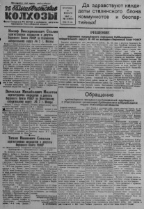 ЗА БОЛЬШЕВИСТСКИЕ КО ЛХОЗЫ *шк*м >**т 1Ш т >«**т *.т г‘ш вш* ш <шяг'*м лт вш т 1Л! n rw i— - * d e m tm— и и г г т г и ч м т и i 14 января Ш47 г-Mi 3 ( 8 М ) Наш к а н д и д а т в д е п у т а т ы Верховного Совета РСФСР Тихон Иванович Соколов Соколов Тихое Иваонвич родился в 1913 году в городе Новсояль, Орловксой области, в семье служащего. По окончании средней школы в 1930 году он работал учителем по ликвидации неграмот ности среди взрослых, а затем в начальной школе. В 1931 году он поступает учиться в Ленинградский сельскохозяйственный институт. По окончаний института, с 1936 года, Тихон;Иванович Со колво работает на Урале старшим агрономом Камско-Березовской МТС Модотовскойбласти. В 1,938 годутов. Соколов выдвигается на работу в Свердловский областной земельный отдел начальцяком овощекартофельного управления, а с 1939 года направляется в город Краснодар,где работает директором и преподавателем Краснодарского сельскохозяйственного техникума. В 1940 году тов. Соколов вступил, в члены Всесоюзной Коммунистической партии (большевиков). В этом же году Краснодарский Областной Комитет партия направляет его в Высшую Партийную школу при ЦК ВКП(б). Война помешала Тихону Ивановичу закончить Высшую Партийную школу. Он был направлен Центральным Комитетом ВКП(б) на партийную работу на Урал в Молотовскую область зав. отделом пропаганды и агитации Соликамского горкома ВКП(б) и одновременно работал зав. кафедрой основ марксизма-ленинизма педагогического института. В 1942 году тов. Соколов Т.И был в ы д в и н у т на долж :v-г м т т ■^ щ -• -Лк ность заведующего сельскохозяйственным отделом Молтоовского Обкома ВКП(б) и вместе с тем продолжал свою педагогическую деятельность по курсу £ Основы марксизма— ленинизма» в сельскохозяйственном институте. С 1944 года Тихон Иваонвич работает заместителем председателя Молотовского облисполкома, а в 1945 г. Центральным Комитетом ВКП(б) направляется в Сибирь на работу председателя исполнательного’комитета Новосибирского областногСо овета депутатов трудящихся. , Партией и пргвительством 19 сентября 1946 года привято важнейшее постановление <0 мерах по ликвидации нарушений Устава сельскохо»8Йственной ар тели и колхозах». Для установления строгого контроля за соблюдением Устава сельскохозяйственной артели, ог раждениа колхозовот попыток нарушения Устава, а также для разрешения вопросов колхозного “троительстеа, но постановлению Совета Министров Союза ССР и Центрального Комитета ВВП(б). при Правительстве СССР создай Совет по делам колхозов. Тихон ИвановичСоколов утвержден членом Совета по делам холхою? при Правительстве СССР и отозвав в Москву для работы в Совете. Всю свою жизнь Тихон И*а човичСоколои шсвятил служению делу большевистской партии, делу народа. Трудящиеся Новосибирской об ласти зннот его как высококвалифицированного специалиста сельского хозяйства в тадантли вого организатора. Вот почему трудящиеся Куйбышевского, Михайловского, Северного, Венгеровского и Чановскою районов на своих пред*выборвых собраниях единодушно выдвинули его кандидатом в депутаты Верховюго Совета РСФСР по Куйбышевскому избирательному округу Новосибирской области Л 440 и нет сомнения и том,что н.биритвла Куйбышевского избирательного округа все, как один, отдадут свои голоса за достойного приставэтем блока коммунистов и беспартийных—Тихона Ивановича Сокол