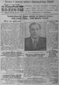 Сегодня, 9 февраля, выборыв Верховный Совет РСФСР! М & Ф л в 'ш щ ф и и т ц /с щ е * 9 ё и п н и ш * е ь ]- ia Ш м иШ Ш кк* К О Л Х О З Ы О р г а н С е в е р н * г » Р К В К П ( б ) и р а й з в в е т а д е п у т а т о в т рудя иди х ая Н о в о с и б и р с к о й в б ла в ти ВОСКРЕСЕНЬЕ 9 ФЕВРАЛЯ 1 9 4 7 г . N * 6 ( * 9 б ) Цена 1Ь кож. Кто хочет , чтобы наше г о с у д а р с т в о *н • п р е д ь было сильным и могучим, тот б у д е т г о л о с о в а т ь з а кандидатов блока коммунистов и беспартийных! Товарищбии-ирзатели! Дружно голосуйте за плаченного патриота нашей великой Родины-Тихона Ивнаовиач Соколова В с е на выборы! К а к к всенародному пра з д н и к у го т о в и л с я н а ш народ к истор и ч е с к о м у дню иыбороз Верхои- й о г * Совета РСФСР. И * » т этот долгожданным день н а с т у п и л . Л я дейвтвительно яоляетсж большим всенародным праздником , джем т о р ж е с т в а советс кой дем о к ра ти и . Сегодня,ровн» в 6 часов у т р а , о т кр ою т с я двери избирательных у ч а с т к о в и рабочие, ке я х е зи и к и , с о в е т с ка я и н т е л л и ге н ц и я — все ивбиратели великом Российской Советской Федеративной Социал и с т и ч е с к о й Р е с п у б л и к и п р а с т у - н я т к вы п оли ен ию своего п о ч е т ного г р а ж д а н с к о г о д о л г а — выборам депутатов Верховного Совета р е с п у б л и к и . Т ы с я ч и избирателей нашего район а се годня т а к ж е я в я т с я к илбяра тельным у рнам , чтобы проголосовать за кандидата блока комм у ни стов и беспарт и й н ы х , за верного вына нашей Ро дины, плам е нн о го советс кого д а т р и о т а — Тихона И ва н о в и ч а Соколова. В ре зульта те ш и р о к о развер- и у в ш е г о с л с о ц и а л и с т и ч е с к о го соревнования в честь выберев ряд колхезов рамена у ж е завершили п о д г о т о в к у к весне. Сотни т р у ж е н и к о в колхозной деревни в э т и дни неказали высокие обра з цы самоотверженного труд а . В с ю д у , где ж и в у т и работают советские люди, к дню выборов г о т о вились преиеводственжые пода р ки . Ист орический день 9 - г о февраля н а с г у п а л . Он я в ит с я днем всенародного п р а з д н и к а , дчем единства а сплоченности нашего народа в о к р у г Советского прави т ельства,п ар тии Ленина-С талина. И сегодня народ идет к избирате л ь н ы м урнам е ч увством высок о г о г р а ж д а н с к о го долга, чтобы проголосовать за л у ч ш и х из л у ч ш и х , з а самых достойных своих сы нов и дочерей, за кандидатов непобедимого сталинского §ло ка к о м м у нистов н бе сп а р т и й н ы х . Голосуя за кандидатов блока коммунистов и беспартийных, н аш народ голосует тем самым за Советс кую власть, за п а р т и ю большевиков, за свею с ч а с т л и в у ю ж и з н ь , за товарищ а Сталина, с именем кото- роге с в я за ны все н а ш и победы. То ва рищ и и зб и р а т е л и ! Д р у ж но гелосуйте за верного сына н а шей Родины, пламенного сове тско го п а т р и о т а — Тихона И в а н о в и ча Соколова! Все на вы бо ры ! Указ Президиума Верховного Совета СССР Об объединении Министерства земледелия, Министерства технических к у л ь т у р и Министерства животноводства в Министерство сельского хозяйства СССР 1. В целях у с т р а н е н и я о р г а н и з а ц и о н н ы х недочетов и параллелизма в р у ко в о д с т в е се льским хо зяйством, а т а к ж е высвобожде н и я с п е ц и а л и в т о в с е л ь с к о г » х о з я й с т в а непосредственно для р а боты в МТС и колх о зах , объедин и т ь М инистерство земледелия, М и н и сте рств о т е х н и ч е с к и х к у л ь т у р и М и н и с те р с т в о ж и в о тн о в о д ства в союзн о-р есп