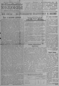 П р о л е т а р и и всех ст р а н , с о е д и н я й т е с ьП тШ О р г а н С е в е р н о г о Р К ВКП(б> и р а й с о в е т а д е п у т а т о в т р у д я щ и х с я Н о в о с и б и р с к о й о б л а с т и ПЯТНИЦА 2 8 МАРТА • 1947 г. № 15 (9С5) Цена 15 кои. Партия и правительство, весь с е ве тский народ ждут от р а б о т н и к е в сельского хозяйства энергичной борьбы за высокие урожаи, ибо в эт ом з а ложено счастье, сила и дальнейший расцвет нашего великого отечества. В Я В И Ш К *1 ВСЕ СИЛЫ — НА ^СПЕШНУЮ ПОДГОТОВКУ К ВЕСНЕ! Путь к высош урожанш Сталинская про г р амма б ы с т р е й - 1 Товарищ, Сталин учит нас , что шего восстановления и подъема сущностью социалистического со- всех отраслей сельског о хоз нйс т - 1р евнов ания является „ То в а ри - ва, ра з вернутая в историческом : щ е с к а я п о м о щ ь о т с т а в ши м со постановлении фев ра ль ског о п л е - , с т о р о н ы п е р е д о в ы х с т е м , ч ю - нума ЦК ВКП( б) , вдохноз ляет | бы д о б и т ь с я о бщ е г о п о д ъ е - колхозное крестьянство, работни ков совхозов и МТС на^славные трудовые подвиги. Призыв б о л ь шевистской партии встретил г о рячий отклик в сердцах миллионов труженников с оциалистичес кого с е ль ског о хозяйства. В ряде районов с траны, где уже р а з в е рну л с я весенний сев, советские люди самоотверженно' трудятся, расширяют посевные площади, з аботятся о повышении урожа йнос ти и увеличении в а л о вого сб ор а всех культур. Широ кое применение агротехники и повышение , производительности т р у д а—з алог успешного решения этих задач. Со всех концов на шей необъятной Родины идут вести об усиленной- подготовке к массовому с е ву . Растет и ширит ся мощное движение за высокие урожаи, за обра з цовое п р о в е д е ние всех сельскохозяйственных ра бот нынешнего года и д о с роч ное выполнение обязательств перед государством. Партия Ленина Сталина, воз главляя с оциа лис т иче с кое сорев нование зовет миллионные массы крестьян на выполнение • этих важнейших г о с у д а р с твенных з а м а “. Алтайцы помнят эго с т а л и н ское ука з а ние и р у ко в одс т вуют ся им в своей работе. Они, ор ганизуя помощь отстающим, до биваются выполнения социалистических обяз ательст в каждым районом, колхозом, бригадой. Сла вные дела колхозников Ал тая и многих других п е р е до в и ков сельског о хозяйства получили всенародное признание и высоко оценены Советским П р а в и тельством. На-днях были опу »ликованы указы Пре з идиума ! грховного Совета СССР о *дрЩ;| )ении з в а ния Героя Социали тического Труда и о н а г р а жд е н и о р д е н а ми СССР б о л ьшо й г( уппы к о л хозников, работников совхозов и МГС—передовиков сель ског о хозяйства, по к а з а вши образцы с амоот верженного труда . Эг о— л у чши е , передовые , наиболее талантливые предст авк ели н а ш е го народа. Среди них Алтайский колхозник Петр Федоре *ич Вари- вода, сцбравший с каж щго г е к т а р а более 215 пуд< в хлеба, Валентина Ме фо д ь е в » ! Раман- ч енк о , з веньевая оДио р из ко л хозов Р ш - т л в г т й “ Ч|И%Й-’Г ПП''У- . Наиболее яркое отраже ние высокий производственный и политический подъем, вызванный р е ше ни е м пленума ЦК ВКП( б) , на шел «замечательном почине работнико в сель ског о хозяйства Алт айского края. Алт айские хлеборобы обратились к т ов а рищу Сталину е письмом, в котором рассказали о своих достижениях и поделились с ближайшими планами. Алтайские колхозники, вступая в социалистическое соревнование в честь XXX й го