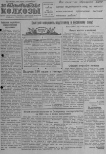 П р о л е т а р и и в с е х с т р а н , с о е д и н я й т е с ь заШ ш идвиапсХке Ш Ш Ж Ж 1 Орган С е ве рн о го Р К ВКГ1(б) и райсовета депутатов трудящихся Ново сиби рской области ВОСКРЕСЕНЬЕ 6 А П Р Е Л Я 1947 г. № 1« (908) Цена 15 к о п . В с е силы— на образцовое зашеря шение подготовки к с еву, на высоко- качественное проведени е весенне- полевых работ! Развернем предмайское социалистическое соревнование ^ Ц р и б л с ж а ю т с я знаменательные даты в ж и з н и нашего н а рода. Через н е с кол ь ко дней наша стр ана будет от мечать день 1 - г о М ая , а 9 м а я — день Побед ы . Эти зн аменательные даты с о в е т с к и й народ встречает в период, когда страна п р и с т у п а л а , к вы пол нен ию грандиозного п л а на второго года послевоенной п я т и л е т к и . Величеств енная п р о г рамма намеченная февральским пленумом Ц К В К П ( б ) по подъему сельского х о з я й с т в а воодушевляем н аш народ на новые героичес к и е по д ви ги во сдаву с м е й лго ^й Р о д з н ы . :вом глубокой рад ссю встретили т р у д я щ и е с я н а ш е г о района У к а з Пре зиди ум а Верховного Совета СССР «О присвоении з в а н и я Героя Социалистическо го Труда и н а г р а ж д е н и и орденами и медалями СССР кол хо зни ков, рабо тников МТС и совхо зов за получен ие вы с о ки х урожаев п ш е н и ц ы , р ж и , к у к у р у з ы , сахарной свеклы и х л о п к а » У с т а н о в л е н ный правительством п оряд о к п рисваивания зв а н и я Героя Социалистического Труда и наг р а ж д е н и и орденами и медалями п о с л у ж и т новым могучим с т и м у лом к д о с ти ж е н и ю победы в борьбе за высокий у р о ж а й . В ответ на заботу наш его п р а в и тельства о колхозной деревне в А й о н е с к а ж д ы м днем все силь - и силь нее разгорается соци а л и с т и ч е с ко е соревнование «а образцовую подготовь у и п р о ведение весеннего сева. Через несколько дней наш р а йон в с т у п а е т в весенний с е в . Для то го , чтобы успешно прове сти вес енн епо левы е работы, надо еще ш и р е р а з верн у ть социалистиче с кое соревнование. К а ж д ы й т р у дящ ий с я долж ен у ч а с т в о в а т ь в предмайском соревновании и в соревновании в чест ь Дня Побед ы . Наш район д е р ж а т нервен- ( ств э в областном соревновании по р а з в и т и ю колхозного ж и в о т новодства. Завоевать первенство в соревновании на весеннем сев е — вот благородная цель, к к о торой должен стр ем ит ься к а ж д ы й т р у ж е н и к села. Боевая задача п а р т и й н ы х , сов е т с к и х , к о м сом ол ь ски х , о р г а н и з а ц и й — всемерно ра з ви ва т ь соревнование в к о л х о з а х , МТС, на п р е д п р и я т и я х , в у ч р е ж д е н и я х , сделать его массовым, вовлечь в соревнование всех т р у д я щ и х с я . Тов арищ и ! Ознаменуем день 1-е М а я и н а ш в е л и к и й п р а з д н и к Победы н о в ы м и тр удовыми у с п е х а м и , д р у ж н о и ор га н и з о ва н но за к о н ч и м п о д го то в к у к севу, начнем полевые работы, об разцово проведем и х , залож им тем самым вы с о ки й у р о ж а й в т о рого года послевоенной п я т и л е т к и . Быстрей завершить подготовку к весеннему севу! В С Е С И Л Ы - H A П О М О Щ Ь К О Л Х О З А М Н а ш е м е с т о в к о л х о з е П о п р е д с т а вл е н и ю р а й к о м а В К Г Ц б ) и р а й и с - п 'о лком аГ— п б раЗ'Цввую п о д г о т о в к у к в е с е н н е - му с е в у Г з а в ы с о к у ю п р о и з в о д и т е л ь н о с т ь т р у д а в п е р и о д п о д г о т о в к и к с е в у з а н о с я т с я н а р а й о н н у ю Д о с к у П о ч е т а : 2 0 . К о л х о з и м . В о р о ш и л о в а (председатель то в . Б л и н о в ) , полностью з а к о н ч и
