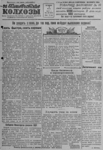 Пролетарии всех стран, соединяйтесь) -ыШ т е& иеймсие К О Л ХО ЗЫ О р г а н С е в е р н о г о Р К В К П ( б ) и р а й с о в е т а д е п у т а т о в т р у д я щ и х с я Н о в о с и б и р с к о й о б л а с т и Ч Е Т В Е Р Г 15 МАЯ 1947 г. № 2 9 (919) Ц е к а 15 ка п . С 15 шо 25 МАЯ ДЕКАДА ЗАВЕРШЕНИЯ ВЕСЕННЕГО СЕВА Т О В А Р И Щ З А П О М Н И ! З а 10 д н е й к о л х о зы нашего района должны з а с е я т ь 6 0 8 0 гектаров. В день н а д о засевать 603 гектаров. Все силы— на выполнение этого ¡здания! Не уходить с поля, до тех пор, пока небудет выполнено задание! ^ е я т ь быстро, сеять хорошо »а первую декаду мая в социалистическом соревновании первое место занял Мало-Карагл - е в с кя й сельсовет, (председатель тов. Столетов, секретарь п а р т о р г а н и з а ц и и тов. С в ис т у нов ) .К ол хозы этого сельсовета выполнили ► п л а н весновспашки на 7 0 , 5 п р о ц . , план сева на 4 5 , 2 проц. Остя* цкий сельсовет, (председатель тов. Н и к и т и н ) , выполнял план весновспашки на 5 5 , 2 процента, п л а н сева н а 4 7 , 7 п р о ц . — з а нял второе место. Передовые кол хо зы района н а к а н у н е за вершения сева я ровы х . К о л х о з ы « П у т ь С т а л и н а » , ( п р е д седатель тов. К о н д а к о в ) , имена ^ Л е м ь я н а Бедного, (председатель ^ Р > в . Ковалев) сосеялд больше 6 0 процентов к п л а н у . Однако, темпы сева в целом по р а й о н у продолжают оставаться явно неудовлетворительными. На 12 мая п л а н сева кол х о зам и р а й она выполнен только н а 31,1 проц. Т а к и е , кол хозы к а к «Память Лен и н а » (председатель тов. А л е к с андров),п лан сева вы пол нен на 1 4 , 6 проц. , и м , 6 - г о съезда Советов, (председатель тов. А г р ы з - к о в ) , посеял л иш ь 1 0 , 4 п роц ., а в колхозе им. Жданова, где пред седателем Ш а е в , п л а н сева ^ в ы п о л н е н только на 1 , 5 проц. Такого положения те рпеть нельзя. Н а с т у пи ли реш ающ ие дни вес еннего сева. Сейчас дорог не только к а ж д ы й день, но и к а ж ды й час. Запаздывание с севом на 10 дней с н и ж а е т у рож ай на 1 6 — 2 0 процентов. Поэтому сев надо провести в сж а ты е с р о к и . М и рит ь с я е медленными темпами сева нельзя. К то у п у с к а е т л у ч шие с ро ки сеза, тот наносит большой ущерб государст ву и к о л х о зн и к а м . М елкая в с п а ш к а с о грехами Снижает у р о ж а й н а 4 — 5 цен тв е р х н о с т з , пришлось проводить дополнигельное боронование. Очень плохо используется на весевнем севе т р а к т о р ный п а р к . В колхозе «Сов е т с к а я Сибирь» газогенераторный т р а к т о р Тартасской МТС п р о с таивает по 5 - 6 часов в с у т к и из за о т с у т с т в и я ч у р о ч е к , которые здесь не были заго товлены, да и сейчас за го тов ка и х п р о х о дит черепашьими те мпами . В кол х о за х Гражданцевского сельсовета 11 т р а к т о р о в .Э т а огромная сила в решающие дни полевых работ бездействует и з - за нераз- воротлавости работников Северн М'ГС и попустительства председателей правлений колхозов. Из 11 тр а кторов то ль ко 2 - 3 т р а к торч. рабо тают и то с перебоями, а остальные с то я т без г о р ю ч е го . Директора МТС т т . Я т и с и Кол чанов должны нести г о с у д а р с т ве н н ую ответственность за ерыв весенних полевых работ. Областной комитет В К П ( б ) и Облисполком обратились к о всем к о л х о з н и к а м и к ол хо зни цам ,б р и га дирам т р а к т о р н ы х и полеводческ и х б ри гад , т р а к т о р и с т а м , п а х а рям, сеяльщикам, ко всем сп е ци ал истам сельского хозяйства, ко всем сельским к о м м у н и с т а м и комсомольцам Новосибирской области с пр и з ы во м— «Не медлите ни одного часа 