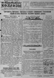 Кр»л*щлрии~"вп€ шрли, еее'ёаняйтес, ! мШшаЯШсШ КОЛХОЗЫ О р ган С е в е р н о г о Р К ВКП(б) и райсовета депутатов трудящихся Новосибирской области В О С К РЕ С Е Н Ь Е 25 МАЯ 1947 г. № 32 (922) Цена 15 коп. „Восстановить в полной м е р е значение д о г о в о р о в м еж д у МТС и об сл уж иваемым и к о л х о з а м и , о п р е д е л я ю щ и х взаимны е о б я зат ел ь ст ва МТС и к о л х о з о в , и осудить п р а к т и к у прен ебреж ит ельно го от- ношения к выполнению д о г о в о р о в (Из по становления П лен ум а Ц К ВКП(б) . 0 м ер а х подъема сельскего хо зяй ст ва в послевоенный п е р и о д ' ) . Трактористы, бригадиры тракторных отрядов и прицепищк!иСтахановским трудом наполях обеспечим получение высокого урожая Р а б о т у т р а к т о р о в —на п о л н ую мощность .На колхозных полях нашего ш Ь н а идет упорная борьба за — оМнчанив сева. Интересы страны настоятельно требуют, чтобы в ближайщие дни сев был з а вершен в каждом колхозе на в ы соком агротехнвческом уровне. Сейчас каждый труженик колхозной деревни должен работать по- боевому, непокдадая рук, напряженно, самоотверженно, не жалея сил. Этого требует наша коммунистическая партия, этого требует весь наш советский народ. Нам надо еще посеять 7078 га, тобы выполнить план весеннего сева. Этм цифры говорят сколь ведикн должны быть усилия всех занятых на нолевых работах, чтобы успеть во время посеять, не упустнть весеннюю влагу, ж т 'в еще работа на полях йне медленно. На 23 мая посеяно только 602 2 г а , т-е. 4 5 , 9 проц. к плану. Плохое использование живого т ягл а — лошадей, быков, коров и особенно тракторов—вот основная причина низких темпов полевых р а бот. Перед машинно-тракторными станциями нашего района стоят огромные задачи. Тракторами должно быть вспахано 4 5 0 0 гек таров, а до сих пор сделано ничтожно мало. Колхозы обслуживаемые Тартасской МТС план сева выполнили на 3 3 ,6 процента, а Северной МТС всего лишь на на 18 ,9 процента. План тракторных работ Тартасской МТС выполнен на 38 процентов. Следовательно и в этом году продолжается практика пренебрежительного отношения к выполне ниго договоров МТС с колхозами. Одна из причин такой пло хой работы тракторного парка— несвоевременная подвозка горючего ■ сказывается недоброкачественный ремонт машин и инвентар я . Директоры МТС я их заместите ли пока только еще раскачиваются. Автотранспорт на всю свою мощность на подвозке горючего неисподьзован. Машины делают рейс за горючим до станции Барабянек по 5-7 дней. Как в той так и в другой МГС не изжиты аварии и простои тракторов.Газогенераторный трактор и колхозе <17 партсъезд» при наличии чурочек простая вает но техническим неисправностям с первых дней весенне- полевых работ. В Северной МТС тракторист колхоза «Новая жизнь ) Коновалов работал на газогенераторном тракторе боз масла, в результате расплавил подшипники заднего моста. Трактор из-за варварского отношения тракториста простоял более 6 суток, подобные же случаи имели место и в колхозе им. 6-го съезда Советов. Трактористка Андреева в колхозе «Советская Сибирь» расплавила шатунные подшипники и колесный трактор простоял четверо суток. Такое положение дальше терпимо быть не может ни вкоем случае. Тракторы решают успех сева. Они должны работать на полную мощность, высокопроизводительно. Сейчас обком* ВКП(б) требует от МТС—увеличить темпы тракторных работ ¿на 30-40 процентов к общему заданию. Пере
