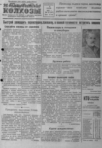 Пролет а р и и всех стран , со единяйт ес ь О р г а н С е в е р н о г о РК ВКП (б ) и райсовета депутатов трудящихся Новосибирской области ВОСКРЕСЕНЬЕ 8 июня 1 9 4 7 г. № 3 7 ( 9 2 7 ) Цена 15 коп. П рополку9 подъем паров, за гот овку к орм о в— весь комплекс полевых работ выполнить высококачественно в лучшие сроки!/ Быстрей завеитрьшпаровспашку,прополку,вполнейготовности встретить сенокос С п а с а й т е п о с е в ы о т с о р н я к о в > Своевременное проввденае прополки посевов от сорняков имеет исключительно важное значение в деле борьбы за получение высоких урожаев. Сейчас наступало время для работ по уходу за посевами. Наряду с проведением паровспашкя во всех колхозах района необходимо широко развернуть работы по прополке зерновых культур и в первую очередь на семенных участках. ^ ^ К а ж д ы й колхозник хорошо зиа какой большой вред приносят сорняки. Они иссушают почву, отнимают у культурных расте ний пищу, затеняют посевы. На засоренных полях резко снижается не только урожай, во и ухудшается его качество. При месь семян многих сорняков, например, куколя и других, портит качество муки, вызывает за болевания у людей. Сорняки сильно мешают убор ке урожая. Оставшиеся на поле сорняки дают огромную массу сорных семян. Можно и нужно полностью уничтожить сорняки. Для этого колхозы района имеют достаточно сил и средств. Своевременная вспашка чистого пара и тща- | ^ л ь в а я обработка вспаханного тшля до посева на нем—вот одно из могучих средств в борьбе с сорной растительностью на полях. Частичные похолодания задержала рост и кущение посевов произведенных в первые дни полевых работ. На посевах много сорняков. Урожай в опасности. Если не уничтожить сейчас сорняки, то погибнет напрасно большая часть урожая и труда колхозников. Борьба с сорняками—важней шая задача колхозников, всех коммунистов и комсомольцев рай она. Необходимо установить на прополке такой порядок, чтобы в каждом колхозе все участвую щве получали ежедневное задание от бригадиров. Выполнение заданий должно проверяться и приниматься бригадиром как по количеству, так и с оценкой по качеству. Нельзя допускать работы скопом. Эго снижает выработку и ухудшает качество прополки. Большое значение имеет хороший учет выполненных работ и население трудодней на основе индивидуальной сдельщины. В аередовых колхозах района приступили к прополке посевов. Гри полеводческих бригады колхоза им. Карла Маркса начали очищать поля от сорняков.Семеноводческое звено этого колхоза, под руководством опытного звеньевого Анкудина Маркеловича Чало в а , работает на своем участке. Звено Василия Ивановича» Безгина на госсортучастке колхоза им. 6-го съезда Советов ведет тщательную прополку. Всего в колхозе прополото 8 га. Сделано еще очень м а м | чтобы спасти посевы от сорняков. Председатели вместе с членами правлений колхозов должны мобилизовать всех колхозников на прополочные работы.Председатели сельсоветов и колхозов обязаны установить ежедневно ¿личный контроль по уходу за посевами. Задача коммунистов, комсо мольцев и сельского актива организовать между колхозами и колхозниками проверку выполнения социалистических обяза- | тельств данных товарищу Сталину в борьбе за получение высоких урожаев. Пашем пары и готовимся к сеноуборке Закончив весенний сев, колхозы Биазинского сельсовета, не медля на одного д