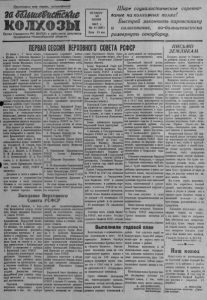 Пролетарии всех ст р ан , соединяйтесь1 заШшае&иста<Ы К О Л Х О ЗЫ О рган С е в е р н о г о Р К В К П (б ) и р айсовета депутатов трудящихся Но восибирской области Ч Е Т В Е Р Г 26 И Ю Н Я 1947 г. № 41 (931) Ц е н а 15 коп . Ш и р е социалистическое соревнование на к о л хо зны х п о л я х ! Б ы ст р ей закончить паровспашку и силосование, по-большевистски р азвернут ь сен о уборк у. В Ц ПЕРВАЯССЕСИЯ ВЕРХОВНОГО СОВЕТА РСФСР 2 0 и ю н я в 7 часов вечера, в Москве, в Большом К р е м л ев с к ом дворце состоялось о т к р ы т и е первой сессии Верховного Совета Р С Ф С Р второго созыва . На сессию с ъ е х а л и с ь д е п у т а т ы язбранные пародами Р о с с и й с к о й Федерация в п а м я т н ы й де н ь 9 февраля. В ы б о ры в В е р х о в н ы й Совет Р С Ф С Р яви л а сь я р к о й де монстрацавй м о р а л ь н о -п о л и т и ч е с кого единства Советского народа, его п а т р и о т и з м а , беззаветной пр еданно сти большевистской п а р т и и и великому С т а л и н у . Среда и з б ра нни ко в н а р о д а — ^ в и д н ы е госуд ар ственны е и общест в е н н ы е де яте ли, Герои Соцаалис ш^ического Т р уд а и Герои Советского Союза, с т а х а н о в ц ы п р о м ы ш ленности и социалистического земл едел ия , деятели н а у к и , к у л ь т у р ы , и с к у с с т в а и л и т е р а т у р ы , ) пр едста вители с л а в н ы х во о р уж е н н ы х с и л советской с т р а н ы . Е щ е задолго до начала заседан и я д е п у т а т ы и многочисленные гост и собираются в зд ан ии Большого Кремлевского дворца. . . . С емь часов ве ч е ра . В п р а - ' ви те л ьетв е нны х дожах появляютс я т о в а р и щ И . В . С т а л и н , т о в а ри щ а В . М. Молотов, Л . II. Б е р и я , А . А , Жданов, А . И . М и к о я н , В . М. Маленков, А . А . Андреев, Н . А . В о зн е с е н с к и й , I I А . Б у л г а н и н , А . А . Кузнецов, М . А . С у - 11 слов, члены Президиумов В е р х о в - * н ы х Советов С С С Р , Р С Ф С Р и м и н и с т р ы . Д е п у т а т ы и г о с т а в едином пор ы в е встаю т и у с т р а и в аю т бурны е овации в ч ес т ь то варища С т а л и н а и его в е р н ы х с о р а т н и к о в . В т е ч ен ие н е с к о л ь к и х м и н у т д л и т с я го р я ч ая овация. Собравшиеся в ы р а ж а ю т любовь и пр еданность т о в а р и щ у Ста л ину , ве л иком у вождю и полководцу, о р г а н и з а т о р у и с т о р и ч е с к и х побед советского наро д а. Сессию о т к р ы в а е т один из ста р е й ш и х депута тов за сл уж е нны й деятель н а у к и и т е х н и к и Р С Ф С Р профессор У р а л ь с к о г о ин ду стрн ального и н с т и т у т а А . П . Головин. По предложению депутата П . С. Совскова В е р х о в ны й Совет единогласно изб ир ает председате лбм Верховного Совета Р С Ф С Р де п ут а т а М. Т . Сара това. Верхо вны й Совет Р С Ф С Р единогласно п р и н и м а е т следующий аорядок д н я : 1. Выборы Мандатн ой К о м и с сии Верховного Совета Р С Ф С Р . 2. И збрание п о с т о я н н ы х к ом и с сий В е р х о в н о го Совета Р С Ф С Р . 3. У т в е рж д е н и е Г о с у д а р с т в е н ного бюджета Р С Ф С Р на 1 9 4 7 г. и у т в е р ж д е н и е о т ч е т а об и спол н е н и и Го сударствен но го бюджета Р С Ф С Р зх 1 9 4 6 год. 4 . Избрание П р е з и д и у м а В е р хо вн о г о С о ве т а Р С Ф С Р . 5 . У тверж дение У к а з о в Презид и у м а В ерхо вно го Совета Р С Ф С Р об образовании н о в ы х М и н и с т е р с т в . 6. Образование П равительства Р С Ф С Р — С о вета М и н и с т р о в Р С Ф С Р . 7 . И збрание В е р х о в н о г о С у д а Р С Ф С Р . 8. Об образовании Редакционной к оми ссии по внесению изм ен е ний в т е к с т К о н с т и т у ц и и Р С Ф С Р . З а т е м В з р х о в н ы й Совет Р С Ф С Р избирает М ан да тн ую Коми ссию в составе 11 ч