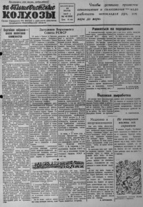 Й р о л ст а р и и всех с т р а н, соед и н я й т е с ь тШтеШтсШ КОЛХОЗЫ О р га н С е в е р н о г о Р К В К П ( б ) и райсовета депутатов трудящихся Новосибирской области В О С К Р Е С Е Н Ь Е 2 9 июня 1947 г. № 42 (932) Цена 15 коп. Ч т о бы у с п е ш н о п р о в е ст и с е н о к о ш е н и е и с и л о с о в а н и е — н а д о р а б о т а т ь н е п о к л а д а я р у к , о т з а р и д о з а р и • Партийное собрание- школа воспитания коммунистов П а р т и й н о е собрание — вы сш и й р у к о в о д я щ и й ор ган к а ж д о й п е р в и ч н о й п а р т о р г а н и з а ц и и и с е р ь езная ш к о л а б о л ь ш е в и с т с к о г о в о с п и та н и я к о м м у н и с т о в . Н а п а р т и й н о м собрании в к о л х о з н о й и л и те рритори ал ь ной о р г а н и з а ц и и о б с у ж д а ю т с я наибо- Рее ж и зн енны е в о п р о с ы п ар тор - анизации . Собран ие дает направ - 1 ление в работе к а ж д о г о члена и кандидата п а р ти и . Решение п а р т и й н о г о собрания должно рассм а т р и в а т ь с я к о м м у н и с та м и к а к з а к о н . К о м м у н и с т ы д о л ж н ы в ы с т у п а т ь к а к единый к о л л е к т и в , им еющ ий своё п р о д у м а н н о е мнение по п р а к т и ч е с к и м вопросам проведения п ар ти йн ой п о л и т и к и . Именно т а к и п о с т у п а ю т члены и к а н д и даты п а р ти и созданной в этом г о д у п ар то р га н и з а ц и и п р и к о л х о зе „ Б о е в и к “ ,О с т а н и н с к о г о сельсовета. П а р т о р г а н и з а ц и я ко л х о за „ Б о е в и к * с е к р е т а р ь т о в а р и щ К в а к у - ш о н о к р е г у л я р н о п р о в о д и т с о б р а н и я . Н а п а р т с о б р а н и и о б с у ж Заседания Верховного Совета Р С Ф С Р 2 3 июня в Кремле, в Большом Кремлевском дворце, состоялось два заседания Верховного Совета РСФ СР— утреннее и вечернее. Оба заседания были посвещены п рени ям по докладу М и н и с тр а финансов РСФСР депутата А . М. Сафронова о Государственном бюдж е те РСФСР н а 1 9 4 7 год и исполнении- Государственного бюд ж е т а РСФСР за 1 9 4 6 год. Все в ы с ту п авш ие говорили о больших д остиж ениях областей, краев и республик , об и с к л ю ч и тельном-политическом и тр у д о вом подъеме, которым охвачены народы Российской Федерации. Добившись новых у с п е х о в в прошлом год у и в первые месяцы нынешне го года, тр удящиеся п о л ны решимости вы п о л н и т ь и пере в ы п о л н и т ь грандиозные планы послевоенной сталинской п я тил е т - ки.Ора торы говорили о том,с к а к и м энтузиазмом было встречено даю тся в а ж н е й ш и е в о п р о с ы ж и з - На местах обращение ленинградцев нн к о л х о з а . За после дн ие т р и Д0Ср()(1Н0М выполнении нро а з - месяца о б с у ж д а л и с ь в опросы о и реализации р е ш е н и й ф е в р а л ь с к о -1 водственной программы к / нояб- го П л е н у м а П К В К П ( б ) , о тчет о р я и обращение а л т а й с к и х колхоз- Каботе з а в е д у ю щ е г о м о л о ч н о - ни ков о соревновании за в ы с о к и й 0 в а р ^ е„дре™ци у р о ж а й . Этот подъем нашел я р к о е выражение в письмах тр у д я щ и х ся к т о в а р и щ у С та л и н у . В ы с т у п л е н и я депутатов р и с у ют зам еча тел ьную к а р т и н у г и г а н т с к о й созидательной работы, которой охвачена сейчас вся н а ша в е л и к а я с трана . Проект Государственного бюджета н а г л я д но отраж ае т д о с т и г н у т ы е у с п е х и и размах предстоящих работ. Все в ы с т у п а вш и е уделяли большое в нимание р а з верн у вш ейс я во всей стране борьбе за послевоенный подъем сельского хозяй ства . Р ешения февральского Пленума Ц К В К П ( б ) стали программой д ей с тв ий де ся тков миллионов колхозников. Ораторы р а с с ка зы 