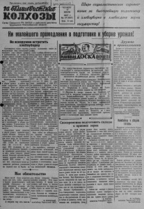 Пролетарии всех стран, соединяйтесь! $иь заИише&мжхке К О Л Х О ЗЫ Орган Северного РК ВКП(б) и райсовета депутатов трудящихся Новосибирской области ЧЕТВЕРГ 17 ИЮЛЯ 1947 г. № 47 (9 3 7 ) Цена 15 коп. Шире социалистическое соревнование з а быстрейшую подготовку к х л еб о уб орке и хлебосдаче зерна г о с у д а р ст в у! W Ни малейшего промедления в подготовке к уборке урожая! Во всеоружии встретить хлебоуборку ► Jjgpe Приближается самая горячая, напряженная пора сельскохозяйственного года—уборка урожая н хлебозаготовки. До начала косовицы озимых остались считанные днж. Поэтому колхозы, МТС лжны образцово подготовиться этой работе, сделать все для того, чтобы быстро, без потерь убрать урожай, с честью выполнить свою первую заповедь перед государством — рассчитаться по сдаче хлеба, тем самым выполнить обязательства взятые в письме товарищу Сталину. Несмотря на все имеющиеся у нас условия, подготовка к уборке урожая в районе проходит совершенно неудовлетворительно. Всего по району план ремонта конно-уборочных машин выполнен на 56 процентов, мо^ дотидок—на 84,6 процента, двигателей и локомобилей—на 88 процентов. Особенно затягивается ремонт зерносушилок. Из имеющихся в районе 49 сушилок монтировано только 1 э . В де колхозов не заботятся о подгодтовке мешкотары, телег, и фургонов. В колхозе «Красный партизан» не подготовлены телеги, мешкотара, не отремонтирована сушилка, но председателя колю- иа тов. Тихонова это нисколько не беспокоит. Позорно отстают с подготовкой к уборке урожая колхозы Чувашннского, Ново Троицкого, Чебаховского сельсоветов. Совершенно плохо готовятся к уборке урожая машинно тракторные станции. Северная МТС выполнила план ремонта комбайнов всего лишь на 79 процентов, Тартасская МТС -из 3 молотилок «МК 1100» не отремонтировала ни о д н о й . Директоры МТС ссылаются на раз- днчные объективные причины и не принимают решительных мер в тому, чтобы ускорить ремонт машин. Основная причина низких темпов ремонта особенно в Северной МТС состоит в том, что там отсутствует четкое руководство работами, ремонтники ие подняты еще на борьбу за строгое выполнение плана ре. моим. Плохо в районе обстоит дело с ва- возом горючего. В практике прошлых лет было много случаев, когда совершенно исправные тракторы, комбайны простаивали сутками из-эа отсутствия горю чего. Этот урок прошлых лет не учтен директорами МТС и в этом году. Разве можно быть равнодушными, когда Тартасская МТС из 30 тонн требуемого, на период уборки горючего завезла всего одну тонну. В Северной МТС из 32 тонн, завезено т о л ь к о 6 тонн. А ведь парк автомашин в этих МТС по сравнению с прошлым годом увеличен в 3 раза. Время до н а чала уборки осталось немного. Надо немедля мобилизовать весь имеющийся транспорт МТС на вывозку горючего. Установить для этого твердый график. Всо сейчас должно быть заправлено на быстрейший завоз горючего. Промедление в этом . важном деле опасно для успешного проведения хлебоуборочных работ. В период уборочных работ может быть ненастная погода. Надо быть готовыми вести уборку, хлебосдачу и в ненастное время. Поэтому необходимо заблаговременно подготовить крытые тока, отремонтировать зерносушилки. Каждый колхоз должен составить четкий п л а н быстрейшей подготовки к уборке урожая и проведения уборочных работ. Надо сейчас же мобилизовать все средства колхозов, М