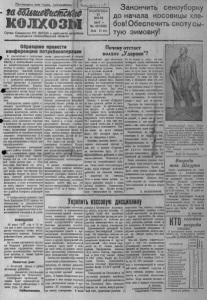 1А Б О Л Ь Ш Е В И С Т С К И Е К О Л Х О З Ы 20 июля 1947 г. №£48 (938) И Т Ц Ц В О Т В Е Т Н А П Р И З Ы В РАЙЖС П О Л К О М А И Р А Й К О М А В КП'(б) Почетный список Л у ч ш и х м олок осдатчиков . Северного р а й о н а выполнивших план м о ло к о п о ст а в о к г о с у д а р с т в у 17. Б у г а е в а П, Н . —выполнившая план молокопоставок и сдала в госзакуп 100 литров. 18. Б л а г о д а р о в а Г. В , —выполнившая план молоокпоставок и сдала в госзакуп 228 литров. 19. Я к о в л е в а А. Т. —выполнившая план молокопоставок I сдала сверх плана 100 литров. 20. Р я б ц е в а А . —выполнившая план молокопоставок * сдала сверх плана 80 литров. 21. К о в а л е в а С. выполнившая план молокопоставок и сдала сверх плана 152 литра. 22. Ш а л я г и н С. С. —выполнивший план молокопоставок и продолжает сдавать молоко сверх плана. 23. С е м е н о в а Ф . Д - выполнившая план молокопоставок и продолжает сдавать молоко сверх плана. 24. Н а л и м о в а А . —выполнившая план молокопоставок и сдала сверх плана 50 литров молока. 25. А б р а м о в а М . —выполнившая план молокопоставок и сдала сверх плана 80 литров. 2 6 . Ф и л и п п о в И. А. — выполнивший план молокопоставок и сдал сверх плана 150 литров. 27. А л е к с е е в Г . П .—выполнивший план молокопоставок и сдал в госзакуп 80 литров молока. Выполнили годовой план Инициатор социалистического соревнования за увеличение надоя молока, живодноводческая бригада колхоза им. Кагановича, Ново-Троицкого сельсовета (зав. МТФ тов. Ларченке), за 6 месяцев текущего года получила надой по 10 4 5 литров молока на каждую фуражную корову. В ответ на призыв райкома и райисполкома эта артель полностью выполнила годовой план молокопоставок го сударству и 20 центнеров сдала в госзакуп. В месячник завершения молокосдачи колхоз им. Кагановича сдаст еще 20 центнеров молока^в госзакуп. Индивидуальные сдатчика заканчивают выполнение плана молокопоставок. 40 Хозяйств »той артели полностью' рассчитались с государством. ФИЛИППОВ. Сдают молоко сверх плана Горячо откликнулись молоко- сдатчики Биазвнского маслозавода на обращение Северного райисполкома и райкома ВКП(б) о досрочном завершении молокопоставок государству. Сдатчики Рябцева, Маляревич, Кемелев, Абрамова и другие выполнили годовой план, молокопоставок и продолжают сдавать сверх плана. Они сдали каждый по 80 лктровсверх плана. Сдатчица молода Ковалева С.—выполнила годовой план молокосдачи еще к 1 июня и сдала сверх плана 152 литра. БОГДАНОВСКИЙ, и н с п е к т о р Б и а з и н с к о г о м а с л о з а в о д а . Э к с к у р с и я по р а й о н у Лето—замечательная пора для интересных увлекательных походов. Пионерская дружина Биазинского детдома еще в мае месяце начала готовиться в пионерский поход. Ребятам хотелось посмотреть учреждения нашего района (типографию, радиоузел, электростанцию, МТС, библиотеку и совершать экскурсию на госсортучас- ток. В конце июня группа ребят в количестве 15 человек отправилась в путь. Пионеры побывали в типографии, где им рассказали как печатается районная газета, они посетили Тартасскую МТС, побывали в библиотеке, на электростанции и радиоузле. Вечерами они просмотрели ря д звуковых художественных фильмов. В числе просмотренных кинокартин «Иван Грозный», «Первое мая» и другие. Большое впечатлепие осталось у ребят от посещения Северного госсортучастка. Им были представлены 6 0 сортов различных культур испытываемых на учас тке. У многих пионеров 