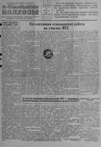 П р о л е т а р и и все х с т р а н , с о е д и н я й т е с ь ! I О В Л А С Орган Северного РК ВКП(б) и райсовета депутатов трудящихся Новосибирской области С У Б Б О Т А 30 А В Г У С Т А 1947 г. № 60 (950) Цена 15 бон. 30 и 31 августа сделаем днями усиленной х л ебо сда ч и . Организуем в эти дни широкий поток к ра сны х обозов с х л ебом . З а два дня кол хо зы р а й о н а должны сдать 4270 центнеров зерна на го с у дарственные склады. ГРАФИК ХЛЕБОСДАЧИ— • НЕРУШИМЫЙ ЗАКОН Наступали решающее дни уборки и хлебосдача. Настало время , ко гд а надо на деле выполн я т ь обязательства, данные в письме товарищу Сталину в честь 3 0 - й годовщины Октября. > Наш район намного отстает от д р у г и х районов области в уборк е ур ож ая и хлебозаготовках . В нашем районе есть еще колхозы, которые не при ст уп и ли к выпол н е н и ю своей первой заповеди перед государс твом— к хлебозаготовкам . В Ново Троицком сельсовете из шести колхозов п р и с т у п и л и к сдаче хлеба гоеуда1Ству только 2 колхоза им. Кагановича и г м . Ч е лю с ки н а . В Ч'укашинском сель- д начал хлебосдачу кол,доз Г й щ м е н п ро л е т а р и и » , а колхозы «Северный Тарта сс», «Красный ь о х о т н и к » и «Победитель» этого Р сельсовета еще не у ч а с т в у ю т в хлебопоста вках. Не к лицу т р у ж е н и к а м Северного района быть в числе отстаю- в С щ и х . Главное внимание надо сей» 1 Л а с сосредоточить на быстрейшей ю с с в и ц е хлебов и выполнении илана хлебозаготовок. А в г у с т о в с к и й план сдачи зерна государс тву должен быть выполнен до 1. сентября. Д л я э т о го 3 0 и 31 а в г у с т а сделаем дн я ми усиленной хлебосдачи. Организуем в эта дни ш и р о к и й п о т о к к р а с н ы х сбозов с хлебом. Не должно быть ни одного колх о з а , не у ч а с тв ую щ е г о в хлебосдаче. Все силы и средства надо пост ав и ть на обмолот, с у ш к у и выв о з к у зерна г осу дарс тв у . За два дня колхозами нашего района надо сдать 4 2 7 0 центнеров з ерн а государс тву. К аж ды й колхоз района имеет а в г у с т о в с к и й план хлебопоставок и конкретное задание на 3 0 и 31 а в г у с т а . Дело чести колх о зни ков , бригадиров и председателей правлений колхозов выполнить своя долг перед Родиной, партией и товарищем Сталиным. Секретари п а р т и й н ы х ор г а н и заци й, председателя сельсоветов и колхозов должны мобилизовать колхозников на преодоление всех т рудностей , которые сейчас стоят на п у т и уборки и хлебозаготовок. Только н а п р я ж е н и е м всех сил и э н е р г и и , использованием к а ж дого трудоспособного колх озника на уобрке урожая и хлебозаготовк а х , мы выйдем в число передов ы х районов нашей области и досрочно выполним свои обязательства перед государством. Выполним с чес тью свои обязательства дачные товарищу С т а л и н у — соберем у р о ж а й без поте р ь , досрочно выполним г о с у д а р ствен ны й п л а н хлебозаготовок. Ответим ежедневным выполнени ем г р а ф и к а хлебосдачи на обращ е ни е обкома партии ко всем колх о зни кам и колхозницам, ко Коллективная стахановская работа на участке М Т С Я работаю участковым м е х а ником Барышевской МТС, Новосибирской области. Весь свой опыт , приобретенный почти за Ю лет работы на молотилке, я передаю т ра к т ори с т ам и комбайнерам, помогаю им лучше освоить т е х н и к у . На нашем у ч а с т ке 10 т р а к торны х бр игад, которые обслуж и в а ю т 8 колхозов. Все тра к тори сты и дсомбайнеры, работающие на моем у ч а с т к е , вып о л н я ю т и перевыполняют нормы. К а к м
