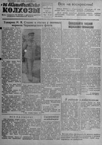 П р о л ет а р и и всех ст р а н , соединяйтесь! ш Ш тС С и таС т КОЛХОЗЫ Орган С еверн о го Р К В К П ( б ) и райсовета д е п у т а т о в трудящихся Новосибирской области В О С К Р Е С Е Н Ь Е 14 СЕНТЯБРЯ 1947 г. № 64 (954) Ц е н а 1 5 коп . В се на воскресник! Обком В К П ( ( и облисполком объявили—14 сентября днем у с и л е н ны х темпов хл е б о с да ч и . Д е л о чести каждого к о л х о з а нашего район а обеспечить досрочное выполнение с в о и х о б я з а тельствш Товарищ И. В. Сталин в гостях у военных моряков Черноморского ф л о т а | Ы 1 9 а в г у с т а к рейсер «Молотов» > ^ и сопровождающие его два эс -1 к а д р е н н ы х миноносца отдал* я к о р ь на я л т и н с к о м рейде . К п р а в о м у т р а п у крейсера «Молотов» подошел сторож евой к а т е р . С не го н а п а л у б у корабля поднялся председатель Совета М и н и с т р о в ¿у Сою за С С Р Г е н е р а л и с с и м у с Советского Союза т о в а р и щ И . В . С т а л и н в сопровождении з а м е с т и т е л я пр едседа тел я Совета М и н и стро в Союза С С Р т о в а р и щ а А. М. К о с ы г и н а и т о ва рищ а А . Н. П о с к р е б ы ш е в а . Т о ва рищ а С т а л и н а и т . т . К о с ы г и н а и П о с к р е б ы ш е ва в с т р е ча л и адмиралы И . С. Ю м а ш е в и Ф . С . О к т я б р ь с ки й . В е с т ь о п р и б ы т и и на к р е й с е р т о в а р и щ а С т а л и н а молнией облетела к у б р и к и , к а ю т ы , м а ш и н - ^ н ы е о т с е к и , ар т и л л е р и й с к и е баш - Р в и . Н а н а ш е м корабле Иосиф В и с с а р и о н о в и ч С т а л и н ! — С о гр о м н о й радостью п о в тор я л и м а т р о с ы , с т а р ш и н ы и офицеры. С и м е н е м ве л и к о г о С т а л и н а э к н п а ж к р е й с е р а в су ро вы е г о ды О т е ч е с т в е н н о й в о й ны доблестно с р а ж а л с я за ч е с т ь н свободу и а ш е й Р о д и н ы . В ы п о л н я я п р и к а з т о в а р и щ а С т а л и н а , м о р я к а в м е с те с в о й с к а м и Со ве тск ой А р м и и з а щ и щ а л и Одессу, Севастополь. Жоскф В и с с а р и о н о в и ч С т а л и н поздоровался с а д м и р а л а м и , к о мандиром кор аб л я и прош ел на нодуб&к . К а п и т а н 2 - г о р а н г а П е т р о в по д н я л с я н а м о с т и к . Получено «Добро» н а в ы х о д . М а л ы й вперед! З в у ч а т ч е т к и е к о м а н д ы . К о рабль р а з в и в а е т скорость . Т о ва р и щ С т а л и н п о д н я л с я на м о с т и к . Т о в а р и щ С т а л и н и н т е р е с о в а л с я т а к т и к о - т е х н и ч е с к и м и д а н н ы м и к о р а б л я , . р а с с п р а ш и в а л , в а с » м а ю т с я в свободные ч асы . П о з н а к о м т е с ь поближе с ж и з н ь ю , п и т а н и е м , обмундированием и б ы т о в ы м и у с л о в и я м и м о р я к о в . О н и достойны, чтобы о н и х хоро шо з а б о т и л и с ь , с к а з а л Иосиф В и с с а р и о н о в и ч , обращаясь к тов. К о с ы г и н у . '''Г'Ш З а т е м т о в а р и щ С та л ин в сопровождении т . т . К о с ы г и н а , П о с к р е б ы ш е в а , Ю м а ш е в а и О к т я б р ь ского п р и ш е л н а ю т . Туда собрал и сь все свободные от в а х т ы . Да зд р а в с т в у е т лю б и мы й вождь и у ч и т е л ь ! — Р о дн ом у С т а л и н у , у р а ! С о т н и голосов п о д х в а т и л и г о р я ч и е слова п р и в е т с т в и й . ж и в у т м а т р о с ы , чем они з а - ! Т ^ ов’ Ю м а ш е в просит сфото потея в св е а с . | г р а ф и р о в а т ь с я , п р и д е т с я удовлеТ Е О р и ь его п р о с ь б у ,— проговорил Иосиф В и с с а р и о н о в и ч , обращаясь к г е н е р а л - л е й т е н а н т у В л а с и к у . М а т р о с ы , с т а р ш и н ы и о ф и церы ра зм е с т и ли с ь п о л у к р у г о м . У в с е х радостные возбуж денные л и ц а . С ю т а т о в а р и щ С т а л и н , сопр о вожд ае мы й г р о м к и м « У р а ! » , прошел на п о л у б а к . Здесь Иосиф Ви с с ар и о н о ви ч увидел 