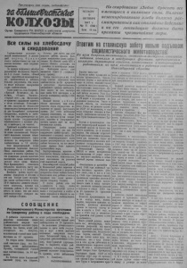 П р о л е т а р и и всех с т р а н , с о е д и н я йт е с ь ! шШте&исШнке КОЛХОЗЫ Орган Северного Р К ВКП(б ) и райсовета депутатоз трудящихся Новосибирской области ЧЕТВЕРГ 9 ОКТЯБРЯ 1947 г. № 71 (961) Цена 15 коп. Иа скирдование хлебов бросить все имеющиеся в к о л х о з а х силы, Наличие незаскирдованного х л е ба должно рассматриваться к а к ст и хийно е бедствие и на его ликвидацию должны быть приняты чрезвычайные меры. Все силы на хлебосдачу и скирдование ЛЁШШякшштвж а Хлебозаготовки в с т у п и л и в самый ответственный в р е ш а ю щей п е р и о д . О д н а к о темпы хлебозаготовок все еще по многим колхозам явцо неудовлетворительны. 8а первую п я т и д н е в к у о к т я б р я ряд колхозов им.Д емьяпа Бедного, и м . 6 -го съезда Советов, «Новый пу т ь » з н а ч и т е л ь н о повы сили темпы хлебозаготовок и добились больших р е з у л ь та т о в . Эти колхо зы с т о я т н а к а н у н е завершения плана хлебозаготовок. Т а к и е к о л х о з ы , к а к « У д а р н и к » . «Красный В а сю г а н е ц » , им. К а л и н и н а , «Память Ч к алова» , «Черный п у т ь » , им. К а г а н о в и ч а по прежнему продолжают плестись в числе отстающих, Р у к о в о д и т е ли э т и х колхо зов не и с пол ь зую т слож ившуюся б л а г о п р и я тн у ю п о г о д у для быстрейшего завершения с к и р д о в а н и я , молотьбы и хлебос дачи. Эти г о р е -р у ков од ит ел и потеряли ч увст во государственной от ветственности и п у с к а ю т убор к у и хлебосдачу н а самотек. Советский па р ти й н о -ко м с о м о л ь с к и й н ко л х о з н ы й а к т и в вместе со всеми к о л х о з н и к а м и Федоровс к о г о сельсовета подняли знамя нового социалистического соревн о в а н и я на завершение плава хлебозаготовок к 1 2 о к тя бря . Этот и а тр и о т и ч е с к и й по чи н федоровцев подхвачен бол ьш и н ством кол х о з н и к о в района. Ряд колхозов и советов пр и н и м а я в ы зов федеровцев решили з а к о н ч и т ь выполнение плана хлебозаготовок раньш е это го срока. Колхозы В е р х -Кра с н ояр с ко го сельсовета п о к л я л и с ь з а к о н ч и т ь сдачу х л е ба го судар ству к 11 о к т я б р я . Комсомол района г о р я ч о поддержал федоровцев и объявил в эти дни боевую в а х т у заверш е н и я плана хлебозаготовок в честь 2 9 й годовщины ленинско с т а д и я - ' с к о г о комсомола, призвал всю молодежь района в эти дни т р у - 1 диться не жалея сил для н о в ы х ! производ ственных подарков п а - шей м а т е р и — Родине . Поэтому дни в а т т ы для всех колхозов района должны быть днями завершения илана хлебозаго тов о к . Па обмолот хлеба МТС и колхозы обязаны по с та в и т ь все комбайны и молотильные м аш и ны . Необходимо сдавать хлеб ежедневно строго пс у т в е р ж д е н ному г р аф и ку . Ч лены сельхозартели им. 6 - г о с ‘ езда Советов выполнили план хлебозаготовок на 95 процентов в резул ьтате перевыполнения ежедневного графика хлебосдачи. Этот колхоз за весь севтябрь едал хлеба 6 1 6 центнеров, а за первую п я т и д н е в к у о к т я б р я 1 2 0 5 центнеров. К а ж д ы й колхоз р а й о н а обязан в ы п о л н и т ь свои обяза те льства перед государством н е зависимо от у р о в н я полученного у рож ая. Для этого необходимо каждом у к о л х о з н и к у , не по кл а дая р у к , к р у г л ы е с у т к и с кирд о в а т ь , молотить и не преры вным потоком сдавать хлеб на за го товительные п у н к т ы . Скирдование хлебов нуж н о за кон ч ит ь в од и н— два д н я . На скирдование хлебов б р о с и т ь все имеющиеся в колхозах с и л ы . Н а л и ч и е не заскирдованного хлеба должн