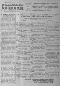 П р о л ш п а р и и ' в с е х стран, соединяйтесь! ыШш&исШке КОЛХОЗЫ О рган С е в е р н о г о Р К В К П ( б ) и райсовета депутатов трудящихся Н о во сиби рс кой области 1 В О С К Р Е С Е Н Ь Е 1 27 О К Т Я Б Р Я г . 1947 № 77 " (9 6 7) Ц е н » 1 5 ко с Д ават ь сокрушительный отпор всем попыткам придержать х л е б , зат я нуть х л е б о с д а ч у , и не только р а з о б лачать всякие антигосударственные тенденции , но и повседневно вести с ними бе спощ адн ую бор ьбу. НЕ МЕДЛИТЬ С ВЫПОЛНЕНИЕМ ПЛАНА ХЛЕБОЗАГОТОВОК Колхозники нашего района обязались в письме товарищу Сталину выполнить план хлебозаготовок к 30-й годовщине О во кт к я о б л р х я. озн С ик ч и ес с ть е ю льх о о п з р а ав тр д е а л л е и й д и а м н . ное Ка с р л л о а Маркса, «Новый путь», им. 6-го съезда Советов, им. Демьяна Бедного и ный маяк». Они подударному труд « и К л ра и с с ь к этом году, вырастилихороший урожай и досрочно рассчитались с государством. В тич р ес е к з о у г л о тьате со р ре аз вн в о ер ва н н у и в я ше з г а ося д со ос ц т и о а й л н и у с ю встречу 30-й годовщины Октября члены этих колхозов работали день и ночь, чтобы сдержатьсвое колхозное слово. к л а е м тв О и о д р н с и а о т к е о с л т ь о в н р о о г р н о ы яде р п у р к к е о о д л в с о х е д о д с з а т о в т в е а , ле и х й л з е -з п б а о р з а а в г л н о е е т п у о д в и о й в к то о р л и х а зо л о ь в н , ы с х ек п р а е р т т а о ре рг й ан ко из л а х ц оз и н й, ых м и ед т л е я р т рис выполнением плана хлебозаготовок. Такая медлительность привелак прямой угрозе срыва выполнения плана хлебозаготовок в установленные правительством сроки и взятых обязтаельств в письме товарищу Сталину. Состоявшееся 16 октября совещание районного партийного актива потребовало] , н б ц о о л т и й и иж к з а а ж а й и в ш д е и о рш е г т о е е к н рр о и д м и я н т м и о п у р н л и и а а п н с л о т ь а а н , о с к е й х а к л ж р еб е д о т п о з а м а а р у г р я о т т ^ о ро к в к г о о о л а к н х лх и о о з з з а в у р ни ай с о то н в а. и Со вс в е ещ х а к н о и л е хо п з р н и и зв к а о ло в,п в а с т е р х иот к и ом ч м е у с ки борющихся за выполнение обязательств п в о ок, до д ср а о в ч а н т ом ь у сокр в у ыши п т ол е н л е ь н н и ыю й о х т л п е о б р озаго т т е о м , п к о т л о не п н р и и е де п р л ж а и н в а а . ет Не хлеб то и льк з о атя р иг аз в о а б е л т ач в а ы ть а в н се т д и н г ев о н с о уадрст в в е е с н ти ые с де н й и с м т и вия, бе н с о по и щадн п у о ю борь Н б о у. некоторые руководители колхозов и после решительного предупреждения на О б организации избирательных о кр у гов по выборам в районный С о в е т депутатов трудящихся Р е ш е н и е № 26 4 и с п о л н и т е л ь н о г о к о м и т е т а Северного р а й о н н о г о С ов ет а д е п у т а т о в т р у д я щ и х с я районном совещании продолжают бездель-]рЫ колхоза). с . С е в е р н о е I. На основании с т а т ь и 145 К о н с ти т у - п ия РСФСР и ст. 41 и 4 2 «Полож ения о выборах г краевые , е б л а с т в ы е , о к р у ж н ы е , районные, у р о д с к и е , сельскяе и поселковые Советы депутатов тр удящ и хся РСФСР» образовать 25 избирательных о к р у г о в , по выборам в Северный районный Совет деп у та тов тр удящ и хся с в к л ю чением в- н и следующие населенные п у н к т ы : Со ве тс ки й избирательный о к р у г № 1 ( ц е н тр с. Севернее, ул. Советская, помещение сельсовета). В состав избирательного о к р у г а входят: у л . Советская и ул. Набережная Ворошиловский избирательный о к р у г № 2 ( ц е н т р е . Северное, ул. Во;ошвлова , помещение р а й к л у б а ) . В состав и