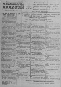 Прол ет а р ии веех стран, соедщкйте< заШ бш е&мШ Ье КОЛХОЗЫ О р г а н С е в е р н о г о Р К В К П ( б ) и р а й с о в е т а д е п у т а т о в т р у д я щ и х с я Н о в о с и б и р с к о й о б л а е т ! ! С У Б Б О Т А 1 НОЯБРЯ 1947 г. № 78 (9 6 8) Ц е н а 15 кон СвШВ9399 В предоктябрьские д н и завершить план хлебозаготовок. Эт о будет л у чш и м подарком нашей м а т е р и- Р оди н е в честь 3 0~й годовщины Великой Октябрьской социалист тческой революции. ВСЕ СИЛЫ НА ЗАВЕРШЕНИЕ ПЛАНА ХЛЕБОЗАГОТОВОК! 2 8 октября состоялся II пленум р а й кома В К П ( б ) .обсудивший вы п олнение реш е н и я районного собрания партийного а к т и в а от 1 6 о ктяб р я о ходе вы п о л н ен и я плана хл ебозаготовок.Пленум отметил, что объявл е н н а я решением собрания партийного а к т ив а д е к а д а . по за верш ению плана хлебоза готовок, сорван а . В з я т ы е обязательства но вы п ол н ены председателями сельсоветов, рядом председателей колхозов и секретарей па рто р га ни заци й о вы п ол н ен ии плана хлебозаготовок к 2 6 октября . Особенно о тстаю т по вы полнению плана хлебозаготовок т а к и е к ол хо зы к а к « П а м я т ь К у й б ы ш е в а » , «С е ве р ны й Т а р т а с с » , « К р а с н ы й В а ою г а н е ц » , « К и н я ш » и продолжаю т т я н у т ь район назад. П л е н у м райкома подверг рез кой к р и т и к е работу о т с т аю щ и х - к о л х о з о в . Кроме того предупредил председателя Б и а з и н - ского сельсовета тов. Абрамова и с е к р е т а р я территориальной па р т о р га н и з а ц и и тов. Иванова, председателя Северного сельсовеI I Об'- -ебразеважйи избирательных участков по выборам в областной, районный и сельские Советы депутатов трудящихся Решение М 266 и с п о лн ит е л ь н о г о к о м ит ет а Северного районного Совета депутатов т р у д я щ и х с я с . С е в е р н о е Н а о с н о в а - ’ и с т а т е й 6 5 , 6 6 , 6 7 , 6 8 , 6 9 , 7 0 , 7 1 , 7 2 «Положения о выборах в краевые, областные,окружные, ра йонные, го роде,кие, сельские и поселковые Советы депутатов т р у д я щ и х с я Р С Ф С Р » исполни- тельный коми тет Р Е Ш И Л ; образовать следующие избирательные уча сте й : С е в е р н ы й и з б и р а т е л ь н ы й у ч а с т о к № 1 (центр с. Северное, помещение дома с о ц и али стической к у л ь т у р ы ) . В сос-тав избирательного у ч а с т к а в х о дя т населенные п у н к т ы : с. Северное нос. Образцово, пос. Вз т и б с к. С е в в р н о - Х о б о т о в с к и й и з б и р а т е л ь н ы й у ч а с т о к № 2 у ч а с т к а вхо- д. Ве се л ая , \ та тов. К р ю ш к и н а и с е к р е т а р я партор га - , 0 Р Л и 14*9 ь н и з а ц и и тов. Спиридонова за неудовлет- и о с - Хойотово, помещение шкоды). верительное руководство хлебозаготовками. К о л х о зы д а н н ы х сельсоветов им е л и все у с л о в и я давно з а к о н ч и т ь полевые работы ж досрочно р а с с ч и т а т ь с я с государством. Однако в от д е л ь ны х к о л х о з а х э т и х сельсоветов еще не закончена молотьба и з а т я г и в а е т с я выполнение обязательств по хлебосдаче. В ре з ул ь т а т е о т с у т с т в и я повседневного контроля за ходом в ы п о л н е н и я ежедн евного г р а ф и к а хлебозаготовок в колхозе, « Со ветская Сибирь» Се верного сельсовета скопилось на т о к а х много зерна, подлежащего сдаче г о с у д а р с т в у , а колхо з еще не з а в е р ш и л в ы п ол н ен ие с в о и х о б я за тельств по х л е б у перед государством. Д и р е к т о р ы Т а р т а с с к о й и Северной М Т С не в е д у т , б о р ь б ы за хлеб. П а р т и й н ы е орг а н и з а ц и и М Т С не обеспечили контроля за сбором н а тур ал ь н о й опл а ты , за работу М Т С . П л а н на т ур ал ь н 