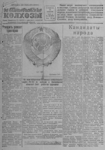 Пролетарии всех стран,соединяйтесь! Орган С е в е р н о г о РК ВКП(б) и р а й с о в е т д е пу т а т о в трудящихся Новосибирской области СУББОТА 22 НОЯБРЯ 1 9 4 7 Г. № 8 4 ( 9 7 4 ) Цена 15 гоп Наши люди выдвигают кандидатами в местные Советы д е п у т а т о в т р у д я щ и х с я лучших сынов и д о ч е р е й с о в е т с к о г о н ар ода , пламенных п а т р и о т о в ,д о к а за вш и х на д е л е с в о ю п р е д а н н о с т ь с о ц и а л и с т и ческой Р о д и н е , великому д е л у Ленина— Сталина, д е л у коммунизма. .Ускорить ремонт 3 тркаторов а Начался самый ответственный период подготовки к * несение посевной кампании МТС—период ремонта тракторов. От своевременного начала ремонта и оконвесь успех тракторного вопросов ремонтных #ш и я его зависит подготовки к севу парка в МТС. Возникают ряд укомплектованию бригад, но подготовке мастерских и цехов, подбор токарей и слесарей. Ра (решением этих >подготовительных вопросов директоры МТС, старшие механики и должны были заняться до начала ремонтных работ. . г'е опаздывать с осенне-зим- ремонтом, тщательно подго товиться к нему, не допускать кустарщину в ремонте, спешку, нарушения технологии ремонта важнейших узлов сложных ма- ^ шин и особенно тракторов —вот основные вопросы, которые нужно учесть при ремонте. Необходимо также составлять график ремонтных работ.но пятидневкам, па месяц и на весь сезон ремонта. ^■■ноябре-1947 -года в сге°м ношении исполком районного Сонета депутатов трудящихся и райком ВКП( б) обязали директора Северной МТС т. Колчанова и директора Тартасской МТС т. Морозованемедленно начать ремонт тракторов. Однако до сих пор ремонт тракторов и прицепного инвентаря в МТС по настоящему еще не начат. Ремонтные бригады в Тартасской МТС укомплектованы формально. Больше половины трактористов находятся в колхозах и на ремонт тракторов в МТС не вызваны. По плану ремонта в четвертом квартале этого года Тартасская МТС должна отремонтировать 16 тракторов, а отремонтировано только 2, вместо 15 плугов—отремонтировано 2. Условия для работы ремонтникам в МТС не созданы. Общежитие, столовая и красный уго- -*лок для ремонтников не организованы. Февральский Пленум ЦК ВКП(б) обязал партийные, советские и сельскохозяйственные органы, а также директоров МТС ликвидировать такой недостаток, как запаздывание с ремонтом тракторов и сельскохозяй ственных машин. Нужно немедленно развернуть работу по ремонту тракторов и прицепного инвентаря, чтобы по примеру передовых МТС нашей области закончить ремонт к 21 декабря—ко дню выборов в местные Советы депутатов трудящихся. К а н д и д а т ы н а р о д а Герб СССР ш Л ’ —*• Прессклише ТАСС. Но воем избирателям» » и н о г о избирательного округа №112 по выборам в Новосибирский областной Совет депутатов трудящихся Товарищи избиратели! 21 декабря этого юда гриж- дане нашей Российской Совтеской Федеративной Социалистической Республики будут выбирать депутатов в местные Советы депутатов трудящихся. Колхозники колхоза им. Карла Маркса, колхозники колхоза им. начальной школы, председателем рабочкома совхоза, инструктором и заведующим партучетом РЕ ВКП(б) Г. М.Филичкин дорос до председателя райисполкома. Волею партии Г. М. Филичкен назначался и работал на ответственных постах—председателем Демьяна Бедного, рабочие и колхоза, зам. председателя рай- служьщие Северной МТС, и кол- исполкома, дектпв учителей Биаз