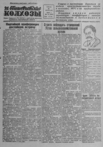 2 ЗА БОЛЬШЕВИСТСКИЕ КОЛХОЗЫ 18 февраля 1948 г. N§ 15 ( § § • ) Ко м с омольская жизнь З а д а ч и комсомольских Вторая сессия федоровского сельсовета Подводя лтоги работы комсомольской организации с июня 1 9 4 6 года по февраль 1948 года, 8-я комсомольская конференция приняла развернутое дшшеяие для дальнейшего улучшение организационной работа и идейно политичск* ого роста е ь м с о м м г й с- кой организации Конференция указала секретарям первичных комсомольских организаций па неправильную постановку работы политкружков, в которых руководителе не придерживаются программы, не контролируют успеваемость и ¡)бсе 1Цаемо( ть с уша- телей. Особенно плохо поставлена работа в кьлхозных Ко м с о м о л ь с к а! органезациях. Секретарям колхозных ьомсомольеких организаций. где не г партийных ор. ганизацей, кеоб одимо вегнл зо- вать свое право, предоставленное им.Х\гШ съездом партии и пов- седневнв вникать в хозяйствен1 ную деятельность колхоза, . ус траняя все недостатки в работе правления. Совершеннонеудовлетг-орител! - но б ы л а постаглена куль- турво*нросвети;рльвая работана селе. Коьфгргнвия обязала секретарей комсомол! ских организаций добиться коренного улучшения работы изб-читален и сельских клубов. В тех селах, где нет изб-читален, организовать красные уголки и выделить лучших комсомольцев красно- у гольцами К работе его и молодежи необходимо привлечь учителей, врачей и специалистов- Вольского хозяйства. Приложить Со усилгя к тому, чтобы улучшить работу веч рвих школи увеличить контингент обучающихся за сч т комсомольцев и молодежи деревни. Плохо была поставлена и пионерская работа. Пионервожатые не занимаются вопросом воспитания организаций детей в духе советксого патриотизма. В связи с эгид конференция потребвоала от пионервожатых школ планировать свою работу в стргоом соответствии 6 постановлением ЦК ВЛКСМ ОТ 13 марта 1947 года. Конференции обязала вновь избе аный состав райкома устранить имеющиеся недостатки в руководстве первичнымимомог- мольс-ими организациями. Покончить с недооценкой орг. низа* ци<нво-полвтичесього укренлеьия комсомольских о р г а н и з а ц и й . Создтаь комсомольские организации в колхозах: «17 лет Октября», «Веселый труд», «1-е Мая», «Советская Сибиьр», «Северный Тартасс», «Правда», им. Коминтерна, им. М. Горького, «Память Чкалова», нм Демьяна Бедного,им.Тимошекко и «Красный урманец». Конференциоябращает осоюе i пинание комсомольских оргаеи . й на работу с нес юз- ноЗ мол.-(южью по вовлечению ее в ччевы КОМ, В целях успешного проведения весеннего сева 1948 году и повыше! ия урож йности, коьф.-рен- ци!< наметила следующие меро- приычия; а) для обеспечения сееа кон* диццонныжмсеме ¡ами в каждом колхозе создать зьенья по очистке семян и комс<мольско-моло* д*ясные посты по сохранению се мевнщо материала; б) в каждомколхозе организовать a i роте«учебу молодых колхоз- пинов Руководителями кружков привлечь агрономови колхозников—опытников; в) организовать сбор местных удобрений, добиваясь выполнения в колхозах плана вывозки навоза и сбора золы; г) о р г а н и з о в а т ь работу Комсомольске* молодежных звеньев, высоокго урожая в колхо зах: им. 6-го съезда Советов, им. Тельмана, «Красный нацмен», им. Карла Маркса, им 17 партсъезда, «Красная звезда,», «Луч света», «Единый путь» и «Ударник». Добиться немедленною закрепления за ними земельных учас