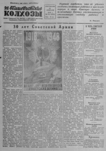 Ш р »лт л р и и в*нс втран, ефевиняйтсеь! ЪйШбшдбистсХие колхозы Ор ган Северного Р К В К П (б ) и райсовета д епута тов трудящихся Новосибирской области Партия гордится, что ей у д а л о с ь создать с помощью р а б о ч и х и крестьян первую в мире К расную Армию , в величайших битвах отстаивавшую и отстоявшую *свободу р а б о ч и х и крестьян. И. Сталин. ПОНЕДЕЛЬНИК 23 Ф Е В Р А Л Я 1 9 4 8 г. № 16 (1 0 0 0 ) Ц ена 15 s o n . 3 0 л е т С о в е т с к о й А р м и и С е го д н я наш народ о тм еч а е т т р и д ц а т и л е т и е своего любимого д е т и щ а — Советской А рм и и . Со здан н ая и в о с п и т а н н а я Л е н и н ы м и С т а л и н ы м , С о ве тск а я А р м и я за 30 л е т п р о ш л а слав н ы й боевой п у т ь . В с я ее и с т о 1 р я я — ж я в о й пример героизма, безза ветного с л у ж е н и я Родине и д о б л е с тн о го в ы п о л н е н и я своего п а т р и о т и ч е с к о г о , воинского д о л га . В е л и к и е в ож д и б ол ьш е в и с т с ко й п а р т и и Л е н и н и С т а л и н предви дели н еи зб е ж н о с т ь и с п ы - т а н я й , ож и д а ю щ и х молодое со- в етское г о с уд а р с т в о . Они п р е д у преждалм т р у д я щ и х с я , ч т о ввергн у т ы е революцией к ла ссы р у с с к и х пом ещ и ко в и к а п и т а л и с т о в п р и л о ж а т все у с и л и я , ч т о б ы в е р н у т ь «вое г о с п о д с т в о , ч т о к ним н а помощь п о с п е ш а т инос тр а н н ы е и м п е р и а л и с т ы . И д е й с т в и т е л ь н о , в первые ж е д н и своего в о з н и к н о в е н и я К р а с н а я А р м и я в ы н у ж д е н а 'б ы л а с к р е с т и т ь о р у ж и е с войсками н е м е ц к и х империалис тов . 23 ф еврал я 1918 го д а еще слабо о б у ч е н ны е и п л о х о в о о р у ж е н н ы е , но с и л ь н ы е революцион ным д у х о м и волею к победе п о л к и Красной А рм и и п о д Нарвой и Псковом разбили ■ ч ис лен но прево с хо дящ ие с и л ы ' н е м е ц ки х з а х в а т ч и к о в . Э т о т день^героичес* к о г о п о д в и г а Кр асной Армии н аш народ об’ я в и л днем ее р о ж ден и я . Со в е т ск а я А р м и я — армия н о вого т и п а и о т л и ч а е т с я о т д р у . г и х армий несравненно более высоким морально-боевым д у х о м . Она я в л я е т с я первой в мире армией осв обожденны х ра бочих и к р е с т ь я н , армией бра тс тва м е ж д у народами нашей с тр а н ы , армией в о с п и т а н н о й в д у х е и н терн ацион али зм а. В этом и с т о ч н и к ее си лы и м о гущ е с т в а . Т р и д ц а т ь л е т С о ве тск а я А р м и я т в е р д о с т о и т н а з ащ и те своей Р о д и н ы , з ащ и щ а я с о в е т с к у ю в л а с т ь , п о л и т и к а к о то р ой соотв е т с т в у е т корен ным интересам рабочего кла сса и к р е с т ь я н с т в а . И м п е р и а л и с т ы А н г л и и , Ф р а н ц и и , Я п о н и и и А м е р и к и в 1918 г о д у н а п а л и на м о ло дую сов е т с к у ю р е с п у б л и к у . Они п ы т а л и с ь с илой о р у ж и я о т н я т ь у ’ нашего народа завоеванное кровью п р а во ж и т ь без э к с п л о а т а т о р о в и с т р о и т ь коммунизм . Один из главарей мировой р е а к ц и и Ч е р ч и л л ь , к о т о р ы й сег о д н я п р и з ы в а е т к войне п р о т и в С С С Р , в а в г у с т е 1919 года х в а с т л и в о з а я в л я л , ч т о он сам поведет на н а ш у с т р а н у 14 г о с у д а р с т в и в сентябре б у д е т в П е т р о гра де , а в де кабре— в Москве Но Ч е р ч и л л ь , к а к го в о р и л Л е н и н , « н е м н о ж к о ч е р е с ч у р расх в а с т а л с я » . К р а с н а я А рм и я ра з г р о м и л а б е л огвардейские банды г е н е р а л о в — Краснова, Кор ни л о ва , К о л ч а к а , Ю д ен и ч а , Д е н и к и н а , В р а н г е л я и о чи сти ла с о в е т с к у ю землю о т бело гв ардейцев и и н тер в е н т о в . Со в е т ск и й народ о т с т о я л свою не
