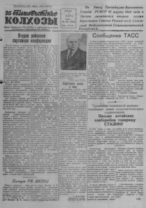 Пролетар ии всех стран, соединяйтесь! ыШтеЯисШЬе колхозы О рган С е в е р н о г о Р К ВКГ1(б) и рай с о в ет а депутатов т р у д я щ и х с я Но во с и б и р с ко й о б л а с т и С Р Е Д А М А Р Т А 1 9 4 8 г № 18 (1002) Цена 15 son. Вторяа пратийняа рйаонаня конференция 28 и 29 февраля в районном Доме культуры проходила вторая районная партийная конференция. Она обсудила отчетный доклад райкома ВКП(б) и ревизионной комиссии, избрала новый востав членов райкома В Щ б ) . С отчетным докладом о работе бюро РК В Щ б ) выступил первый секретарь РК BKIL6) тов. Рыбаков. Он отметил, что за отчетный период районная парторганизация проделала немалую работу по организационному укреплению вновь созданных парторганизаций колхозов и проведению в жизнь исторического постановления февральского Пленума ЦК ВКН(б). Большое место в докладе было уделено работе но повышению идейно-теоретического уровня коммунистов в райпартшколе, в кружках основного типа и в политшколах при первичных партийных организациях. Тов. Рыбаков подробно рассказал партийной конференции о состоянии дел в колхозах района по итогам 1947 года и о ходе подготовки к посевной кампании 1948 года. Конференция проходила на высоком идейно-политическом уровне с хорошей активностью участников. Коммунисты в своих выступлениях на партийной конференции подвергли резкой критике недостатки в работе райкома партии по руководству первичными партийными организаци' ями колхозов и указали на резкое снижение массово-политической работы среди колхозников после проведенных выборов в местные Советы депутатов трудящихся. Коммунисты с особой силой критиковали работу райкома партии за недостатки в работе по pea. лизации постановления февральского Пленума ЦК ВКП(б) «О мерах подъема сельского хозяйства в послевоенный период». Район не добился в 1947 г о ду получения плановой урожайности, что привело к тому, что ряд колхозов остались в долгу перед государством по хлебозаготовкам. Район также не выполнил план воспроизводства поголовья Овец, свиней и лошадей. Партийной конференцией избраны в новый состав райкома следующие товарищи: Филичкин Г. М , Виничонко М. А., Чалков Е. А., Шакинко М. И ., Ас-абин И. Я . , Зырянов М. Ф., Третьяков П. А., Морозов В. В., Перетяган В. А., Пушкин И. 11., Рыбаков И. В., Савицкая В. И , Бугаев A. J . , Иьяиков И. И., Савин П. М., Маевский И. В., Машко И. Т., Гордеев А. П , Агрызков А. И., Новиков С. А., Ефимов А. Т., Салмин Г. Г., До. лотов И. И., Попова В. Н., Пикапов А. В., Иванов Л. И., Шиманская Н. А , Баранов II. С. Кандидатами в члены райкома избраны товарищи: Пономарев В. С., Северин И. А., Абрамов A. И., Харузина Н. Ц., Багров B . С.,Гришин U.M., Кравчук У . Н. В ревизионнную комиссию избраны товарищи: Козик И. В., Влохин П. К., Белов Н. К., Шаламов В. Е., Свиренков С. С. Делегатами на IV областную партийную конференцию избраны товарищи:Рыбаков И. В. , Зырянов М. Ф., Агрызков А. И. Районная партийная конференция обязала райком партии и первичные парторганизации колхозов и сельсоветов особое внимание уделить вопросам под готовки и проведения весеннего сева, полностью в этом году реализовать постановление февральского Пленума ЦК ВКП(б), чтобы перевыполнить плановую урожайность всех культур, воспроизводство скота и досрочно рассчитаться с государством— выйти победителями в соцсоревновании с Куйбышевским районом. Особое внимание партийная конференция уделила вопросам по
