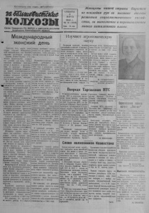 Пр олет ар ии всех ст р ан, соединяйтесь! заИишМистские К О Л Х О З Ы Орган С е в е р н о г о Р К ВКГ1(б) и райсовета депутате* трудящихся Новосибирской области С У Б Б О Т А М АРТА 1948 г. Мо 19 (1 0 0 3 ) Цена 15 коп Женщины нашей страны борют ся не пок ла д ая р у к за высокие темпы ра звит и я социалистического х о з я й ства, за выполнение и перевыполнение нового пятилетнего плана. Международный ж енский день Ежегодно 8'ГО марта наша страна отмечает Международный женский день, как великий праздник трудящихся женщин, Партия Ленина-Сталина н Советское Правительство создали все условия для того, чтобы советские женщины получили доступ к политике, к просвещению, к культуре. Женщины являются активными строителями нового коммунистического общества. Советское государство вложило огромные средства в организацию охраны материнства и младенчества Все этапы развития советског о государства, начиная от революционного завоевания власти, борьбы за индустриализацию и коллективизацию страны и кон чаи великой битвой с фашизмом, тесно связаны с самоотверженной ролью женщины. Во всех областях социалистического строительства самоотверженно трудятся советские женщины. Велико значение женщин в сельском хозяйстве. 350 Тысяч колхозниц руководят бригадами и животноводческими фермами, 15 тысяч женщин—председатели колхозов и их заместители. Советские женщины активно участвуют в управлении государством. Среди депутатов Верховного Совета СССР—277 женщин, среди депутатов Верховно* ге Совета союзных и автономных республик—около 2-х тысяч. Женщины хорошо видят и знают, что советская власть— родная власть, которая дала женщинам свободу, Партия большевиков является родной партиен. Это она вывела всех советских женщих из темноты и бесправия, подняла их общественную и хозяйственную деятельность и ведет женщин к еще более светлому будущему. Вот почему советские женщины едины и сплочены вокруг партии Ленина—Сталина и Советского Правительства, вокруг вождя и учителя—товарища Сталина. Международный женский день этого года трудящиеся женщины нашей страны встречают в условиях широкого патриотического под‘ема трудящихся города и деревни за досрочное выполнение третьего решающего года послевоенной пятилетки, за успешную подготовку и проведение весеннего сева. Труженики Алтайского края призывают всех работников сельского хозяйства Советского Сою- за развернуть социалистическое соревнование за новый под‘ем сельского хозяйства в 1948 году. Нет сомнения, что трудящие' м нашего района и в первую очередь женщины дружно откликнутся на призыв алтайских хлеборобов, чтобы умножить богатства колхозов я нашей Родины. Передовые колхозницы нашего района, добившиеся высоких производственных успехов в 1947 году, в результате патриотического отношения к труду имеют хорошие показатели в деле выполнения производственных планов. Гуренкова Матрена, доярка колхоза им. Кагановича, только за один месяц надоила по 270 литров молока от каждой закрепленной за ней коровы. Отлично трудится звено высокого урожая под руководством Ольги Кулачковой в колхозе «Правда» При Явлинского сельсовета. Замечательных успехов добились передовики маслодельной промышленности, досрочно выполнили план выработки масла первого- квартала. Заведующая сливкоотделения деревни Бергуль Марфа Емельянова 