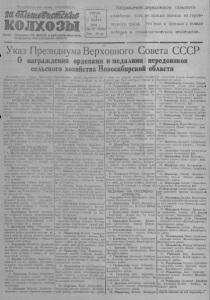 П р омет а р и и всех с т р а н , со е д и н я й т е с ь ! ЗйШтеШтскЬе ' . ’ О р г а н С е в е р н о г о Р К ВК Г1 (б) и р а й с о в е т а д е п у т а т о в т р у д я щ и х с я Н о в о с и б и р с к о й о б л а с т и С Р Е Д А 17 | . МА Р Т А 1 9 4 8 г. | № 22 ( 1 0 0 6 ) : Цена 15 е о п. Награждение передовиков сель ско го х ч о е з с я к й о с г т о ва тру е д с а т . ь Э не т о то е л щ ь е ко и о п ц р ен и к зы а в и к х г н е о р в о ы и м победам в социалистическом земледелии. Я В Ш В Я Я Ш Н Н В В - ■^ К Я В Л а Я Ш В И М Г М Указ Президиума В ер х о в н о го С о в е т а С С С Р 0 награждении орденами и медалями передовиков сельского хозяйства Новосибирской области В соответствии с Указом Президиума Верховного Совета ’СССР от 29 марта 1947 г н о и д ц а ы за и п р о ж л и учен п и ри е в в ы ы со п к о и лн х е у н р и о и жае к в ол п хо ш зо е м обязательных поставок и натуроплаты за н р в а о е б с ст е о и н ты н " е С г М е о м Т е с С н е а в м в а и 1 1 9 з 9 4 е 4 8 р 7 н г о о в г д ы о а д х у и куль о т б у е р спеч д е л н я н а г р а д и т ь ; О Р Д Е Н О М ' Л Е Н И Н А 1 . Г о р и н у в р у ай ю он к а о , лхо п з о а луч « и Л в М ь ш н а у р о ю и во ю д», у С р е о м ж М е а а н й с о л в я н н р у и ж —н и с з к в о е г 2 н о 9 - ьец т е а н р т 2 о н . в е . ров с гектара на площади 10 гек М е з е н ц е в а Николая Николаевича - ........... председателя колхоза «Новый городок», Б ж о а л й отп п и ш н е с н к и о ц г ы о р 3 а 0 й , о 0 н 7 а, ц п е о н л т у н ч е и р в а ше с го гек у т р ар о а на площади 40 гектаров. 3. Т у р и к о в а Семена Степановича— звеньевого колхоза «Знамя труда», Мош- конекого района, получившего урожай р щ ж а и ди 3 9 0 , г 2 е 4 кт ц а е р н о т в н . ера с гектара на плоО Р Д Е Н О М Т Р У Д О В О Г О К Р А С Н О Г О О Н А М Е Н И 1. В а с и л ь е в а -Александра-Семенов«-. ча —звеньевого колхоза «Борец труда», Чановского района, получившего урожай, пшеницы 22,6 центнера с гектара на площади 8 гектаров. 2. В а с и л ь е в у Екатерину Ульяновцу — звеньевую колхоза «Гранит», Тогучин- н с д к и и о ц г 3 9 ы о . г р 2 е а к 0 й т о а н ц р а е о , н в т п . н о е л р у о ч в ив с шу г ю екта у р р а ож н ай а пл п о ш щ е а В а с ю т и н а Степана Ивановича— председателя колхоза г з о ан у » р , ож Н а о й во р с ж иб и ир 2 с 0 ко ,0 г 4 о ц р е а « н й К т о р н н а е а с р , н а ы по й л с у . г ч е п и к а в т р ш а т р е и а на площади 41 гектар, 4. В о л к о в а Федора Симоновича — звеньевого колхоза «Факел революции», И ж с а к й ит р и ж м и ско 2 го 4,5 рай ц о е н н а т , нер п а олу с чив г ш е е к г т о ара урона площади 9,96 гектара. 5. В о р о б ь е в у Клавдию н у—звеньевую колхоза труд», Искитимского район «О а, св п о о б л о у ж ч д и е [ в н Г ш н р у ы и ю й горьев т у а р р о а жа н й а п п ш ло е щ н а и д ц и ы 1 2 0 0 ,7 ,64 ге ц к е т н а т р н а е . ра с г е к 6. Д р о з д о в у Федору Степановну— колхозницу колхоза «Льновод», Масля- шшского района, отличившуюся при ра ботев звепеща участке которого получен урожай ржи 32,06 центнера с гектара па площади 9,87 гектара. 7. З а в ь я л о в а Климентия Ампанисови- ч а—бригадира колхоза им. Щетинкина, Тогучивского района, получившего урожай р щ ж ад и 8 и . 2 2 0 8 ,6 ,4 4 6 ^ ц г е е н к т т н а е р р а а . с гектара на пло З а и ч к о Александру Яковлевну— звеньевую колхоза «Гранит», Тогучинско- го района, получившую урожай цы 22. центнера с гектара на площа п д ш и ен 1 и 0 гектров. 9. К а з а к о в а Михаила Дмитриевича —звеньевого колхоза «Гранит»,- Тогучин-. с н к и о ц г ы о р 2 а 1 йо ц н е а н , тн п е о р луч с ив г ш ек е т г а о ра ур н о а жай пло п щ ш ад е и 10 гектаров. 10. К о з л о в а Николая Петровича