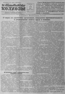 П р о л е т а р и и вс ех с т р а н, со е д и н я йтесь г ш.ШтШшЫке КОЛХОЗЫ О р г а н С е в е р н о г о РК ВКП(б) и райсовета депутатов трудящихся Новосибирской области В С о в е т е Совет М ини ст ро в С С С Р считает,что задачи дальнейшего подъема сельского х о з я й ст в а , повышения производительности труда, р о ст общественного х о з я й ст в а ,д о х о д о в к о л х о з о в и к о л х о з н и ков требуют значительного у л у ч ш е н и я организации и у п о р я д о ч е н и я оплаты труда в к о л х о з а х. М и н и с т р о в С С С Р С У Б Б О Т А 3 И Ю Л Я 1948 г. № 53 (Ю 3 7 ) Дека 15 коп О м е ра х по улучшению организации, повышению производительности и у п ор я д оч е н ию оплаты т р у д а в к о л х о з а х Совет М и н и с т р о в СССР с ч и т а е т , что задачи дальнейшего под ‘ еча .с е л ь с к о г о х о з я й с т в а , п о в ы ш е н и я производительности т р у д а , рост общественного х о з я й с т в а , д о ходов к олхозов и к ол х о з ни к ов т р е б ую т з н а ч и те л ь н о го у л у ч ш е н и я о р г а н и з а ц и и и у п о р я д о ч е н и я опл а ты т р у д а в ко л х о з а х . Н а р я д у с большим полож итель ным о п ы т о м , на к опл енны м кол хо зам и по орган и з а ц и и и оплате тр у д а , Совет Министров СССР о т м е ч а е т , что во м н о г и х колхозах в этом деле имеются к р у п н ы е недостатки, тормо зящ и е д а л ь н е й ш и й рост производите л ь н о с ти т р у да колхозников и развитие о б щ е с тв енно го х о з я й с т в а колхозов. Основными недостатками в органи заци и и оплате тр у д а кол хо зни ков я в л я ю т с я с л е д у ю щ и е : н а л и ч и е обе зл и ч ки в использовании земли в к о л х о з а х , в ы р а ж а ю щ е й с я в том, ч т о за полеводческими бригадами не всегда з а к р е п л я ю т с я у ч а с т к и на н о л я х севооборота, ч то мешает нод'ему урожайно' с т и . Во м н о г и х к о л х о з а х не л ик в и ди ро в а н а т е к у ч е с т ь состава б р и г а д ; средства прои зво д ств а , з а к р е п л е н н ы е за бри гадой , часто и с п о л ь з у ю т с я в не б р и г а д ы , без в е дома б ри гад и ра . Подобная п р а к т и к а н а р у ш а е т нормальн у ю р а б о т у бри гады и с н и ж а е т ответс т в е н н о с т ь бри гадира за состояние дела в бри гаде . В ряде колхозов недостаточно п р и м е н я е т с я оп р а в д а в ш и й себя о п ы т з в е н ь е в о й системы ор гани з ац и и т р у д а ; применение у с та р еш ш г х з а н и ж е н н ы х норм вы р а б о т к и и з а в ы ш е н н ы х расценок ра б о т в т р у д о д н я х . Многие колхозы не п е р е с м а т р и в а ю т норм в ы р а б о т к и в течение н е с к о л ь к и х л ет и тем самым вс у ч и т ы в а ю т д о с т и г н у т о г о р о с т а производитель ности т р у д а к о л х о з н и к о в ; в то р о с т е п е н н ы е подсобные р а б о т ы в ряде с л у ч а е в оплачи в а ю т с я в ы ш е , чем осн овные полевые р а б о т ы н работы в животноводств е, что п р и в о д и т к з а т я г и в а н и ю сроков проведен и я с е л ь с к о х о з я й с т в е н н ы х работ и к рас т р а т е т р у д о д н е й ; ра спро с тр а н е н и е во м н о г и х к о л х о з а х у р а в н и л о в к и , когда доходы колхозов р а с предел яю тся вне зависимости от р е з у л ь татов работы б р и г а д , зв е н ь е в , ферм и о т д е л ь н ы х к о л х о з н и к о в , вследствие ч е г о честные и хорошо работающие кол хо зни - г, Об ор г ан и за ц ии т р у д а т р у д о д н е й 1 1. С ч и т а т ь в а ж н е й ш е й задачей в деле у л у ч ш е н и я о р г а н и з а ц и и тр у д а в к о л х о з а х всемерное у к р е п л е н и е п о с т о я н н ы х п р о и з в о д с т в е н н ы х бри гад , к а к основной формы о р г а н и з а ц и и ар тельпого тр уда . П ред л ож и т 