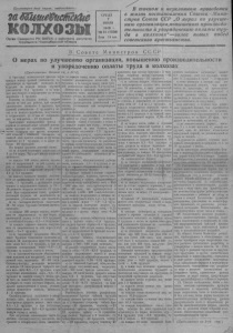 OTA П р о л е т а р и и в се х с т р а н, со е д и н я йт е с ь/ ШЩ& Орган Северного РК ВКП(б) и райсовета депутатов трудящихся Новосибирской области СРЕДА 7 ИЮЛЯ 1948 г. № 54 (1038) Цева 15 коп. В точном и неуклонном проведении в жизнь постановления Совета М и н и стров Союза С С Р „ О м ерах по у л у ч ш е нию организации,повышению производительности и упорядочению оплаты труда в к о л х о з а х “ —залог новых побед советского крестьянства. В С о в е т е М и н и с т р о в С С С Р О мерах по улучшению организации, повышению производительности и упорядочению оплаты тр у д а в к о л хо з а х (П р о д о л ж е н и е . Н а ч а л о з) бригадиру полеводческой бригады за каждую лошадь средней упитанпости, закрепленную за бригадой, начислять 0 ,2 трудодня, за каждую лошадь хорошей упитанности— 0 ,4 трудодня и за каждого полученного и вырщенного до 0т ‘ ема жеребенка —3 трудодня. Ездовому за каждую лошадь, закрепленную за ним для работы, при средней упитанности начислять 3 трудодня, при хорошей упитанности— 6 трудодней в месяц и за каждого жеребенка, полученного и сохраненного до от‘ ема от закрепленных за ним кобыл, — 10 трудодней. Бригадирам полеводческих бригад и ездовым за лошадей ниже средней упитан ности трудодни не начислять. За допу- хцспио ыобитости или других повреждений лошадей с виновных' списывать за каждый день простоя лошади до ее выздоровления по 2 трудодня, а за аборт кобылы—20 трудодней. На фермах крупного рогатого скота: а) за дояркой скотницей закреплять от 8 до 14 корок. Трудодни доярке-скотнице начислять: за каждые 100 литров молока, надоен, пого от закрепленной за пей группы корок, к пастбищный период от 1,2 до •1,8 трудодня и к стоДлокый период— -от 2,2 до 3,2 трудодня; за каждого здорового теленка полученного от закрепленных за пен коров и нетелей,— 7 трудодней, а за каждого полученного и выращенного теленка до 15 — 2 0 -дневного возраста начислять-12 трудодней. При выращивании телят дояркой- скотницей трудодни ей начисляются по расценкам, установленным для телятниц; б) за скотником-пастухом закреплять 30 — 50 корок. Трудодни скотнику.пастуху начислять: за каждые 100 литров молока, надоенного от закрепленных за ним корок, в пастбищный период от 0 , 4 — 0,5 трудодня и в стойловый период— 0 , 7 — 1,0 трудодня; за каждого здорового теленка, полученного от закрепленных за ним корок и нетелей,— 2 — 3 трудодня; в) за телятницей закреплять 2 0 — 25 телят. Трудодни телятницам начислять за каждые 10 килограммов прироста живого веса телят 0,8 — 1,3 трудодня, а при отсутствии взвешивания телят— 0,9 — 1,3 трудодня за каждую голову в месяц; г) за скотником1пастухом, обслуживающим молодняк или нагульный, или откормочный скот, закреплять 30 — 50 голов. Скотнику-пастуху молодняка начислять за каждые 10 килограммов прироста леи- вого веса скота 0,8 — 1,0 трудодня, а при отсутствий взвешивания скота-—0,5 — 0,7 трудодня за каждую голову в месяц; кроме того, за каждого здорового теленка, полученного от телки случного возраста, покрытой производителем в сроки, установленные правлением колхоза, начислять 2 - 3 трудодня. Скотнику-пастуху нагульного и откормочного скота начислять за каждые 10 килограммов прироста живого веса скота 0,8 — 1 ,2 трудодня, а при отсутствии взвешивания скота 0 ,6 — 0,8 трудодня за каждую голову в месяц. При отсутствии взвешивания скота телятнице, скотнику-пастуху молодняка, нагульного и откормочного 