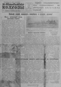 П р о л е т а р и и всех с т р а н, соединяйтесь! la ffiM u te S u m c tá te КОЛХОЗЫ Орган Северного РК ВНП(б) и райсовета депутатов трудящихся Новосибирской области С У Б Б О Т А 1 0 И Ю Л Я 1048 г. № 55 (1039) Дека 15 коп. ре социалистическо е ' соревнование з а успешную з а г о т о в к у кормов! МШШЫШВВЯЯВВВ й V ' Полным ходом развернуть сеноуборку в каждом колхозе/ Июль— р еш аю щ и й месяц з а г о т о в к и кормов 01-4, Вез п р е у в е л и ч е н и я можно с к а з а т ь , что у с п е х зимовки скота р е ш а е т с я в эти дни. Только в том колхозе будет обеспечено у с пешное- проведение стойлового содержан ия, в котором не будет н е д ост а т к а к ор м о в . П оэ т о м у з а г от о в ка кормов я вл я е т с я перво с тепенн ой задачей. В т е к у щ е м году колхозы н а ш е го р а й о н а должны заложить 1 5 т ы с я ч то нн силоса, з а г от о ви т ь 4 8 7 т ы с я ч центнеров сена. К а ж дый колхоз имеет все условия не т о л ь к о в ы п ол н и ть , но и п е р е в ы п о л н и т ь п л а н за гото вки кормов. В т е х к о л х о з а х , гд е хорошо под- v "т ..п ились к сенокосу, у я с н и л и л всю в аж н ос т ь этой работы за. г от о в ка кормов проходит у спешно . В колхозе им. 6- го съезда Сов е т о в , Гр аж д а н ц е в с к о го сельсо в е т а план з а кл а дк и силоса в ко л и ч е с т в е 3 4 0 т о п и у ж е давно * вы п о л н е н . С е йч а с по л ны м ходом у р а з в е р н у л и сенокос. Н е п л о х о в е дут з а г о т о в к у кормов в колхоз ах и м . 2 - а я п я т и л е т к а , им. Тпмо* ш снк о . О -Д Й Ш ' в целом г о т о в к о й кормов отстае июля 1 9 4 8 г о д а план силосова п и я вы полнен всего л иш ь на 5 9 , 6 п р о ц е н т а , застоговано сена толщ к о 4 4 7 центнеров. Кр ай не пинс к ие т е м пы заготовки кормов в к о л х о з а х Северного сельсовета. З д е с ь скош епо более 1 0 0 г е к таров тр;ш, д у ш н а за сто го ва н ного '.p eí. Да '• “ обстоит Щ й и в иолхщщх 'б'анайойсаого сельс овета. Х щко т -го, 'председатель с е ,Р ; е ш щ ф щ -j. {,) rV ов СМитает, что •колхозы цуцдтку'юв;: ь ш ь за з и г о тен-.: у к«} нз п л а н а 1 7 ты с я ч , центнеров, не з а с к и р довано н и одного ц е н т н е р а . Н ев ы п о л п и л и к ол хо зы этого сельсовета и я л а н с ил о со ва ни я . Председатель с е л ь с о в е т а и п р е д седатели колхозов не ч у в с т в у ю т о тветственн о сти за выполнение п л а н а з а г о т о в к и кормов. А ведь в к олхоз ах этого сельсовета в п р ош л ом голу бедствовали и з - з а н е х в а т к и кормов. Н е р а з в е р н у л и и о - п а с т о ящ е м у сено кос к ол х о з ы Ч у в а ш и н с к о г о и Привели не кого сельсоветов. Основная п р и ч и н а з а т я ж к и с е но кос а в к о л х о з а х э т и х сельсо в е т о в — п л о х а я о р г а н и з а ц и я т р у да, еще не всё на селение в ы ш ло на л у г а , далеко не все м а ш и н ы в к л ю ч е ны в работы. В к о л х о з а х Ч е б а к о в с к о г с с е л ь со ве та из 4 - х пи одна с е н о к о с и л к а н е раб о тае т . В колхозе им. К а л и н и н а на се но косе из 9 7 т р у до способных работает только 65 человек. С е й ч а с к а ж д а я .а ртель района имеет в о з м о ж а ^ -увеличит! . в 2 — 3 раза к ол и чество я а за г о т о в к е сена. . у !#; •.' д Р ; И ю л ь — реш ающий месяц за го т о в к и к ормов. Приближается уборка урожая . II если до начала уборки не б у д у т заготовлены кор ма, то это б удет грози ть пе вы полнению плана заготовки к о р мов, чего допусти ть ни в коем с лучае н е л ь з я . До начала уборк и к о л о с о в ы х хлебов полностью з а к о н ч и т ь сеноуборку — такова г л а в н а я задача. Успешное в ы полнение ее создает необходимые условия для б ы с т р о г о восстановл е н и я и р а з в и т и 