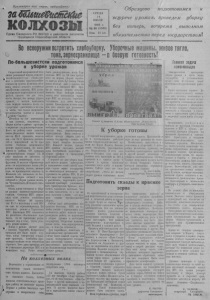 П р о л е т а р и и все х с т р а н, со ед иня йт ес ь / мШтеЯисШ сКЬе К О Л Х О З Ы Орган Северного РК ВКП(б) и райсовета депутатов трудящихся Новосибирской области С Р Е Д А 14 ИЮЛЯ 1948 г. № 5 6 (1040) Цеиа 15 san. Образцово подготовимся к всцгрече у р ож а я , проведем у б о р к у без потерь, во-время выполним обязательства перед государством\ С Во всеоружиивстретить хлебоуборку. Уборочные машины, живое тягло, тока,зернохранилища - в боевую готовность! По-большевистски подготовимся к уборке урожая лин С н к о ор р о еш са а м ю ы щ й и н й а п пр ер я и ж о е д н с н е ы д й ьс п к о о д - ± х в ж о е а з н я я н й ы с и е тв з п е а р н г о о н д т о у о г к в о т к о г и о в д . с а Д е о — л н ь у с а б к ч о о а р х л к о а а з .к я у о й р с с о о т вицы озимых остались считанные д н н ы и о .П бр о а э з т ц о о м в у о к п о о л дг х о о т з о ы в , ит М ь Т ся С к д э о т л о ж й работе, сделать все для того, чтобы быстро, без потерь убрать урожай, с честью выполнить с с ч у в е д ою а х р л с е п т б е в а р о , в м у — т ю ем ра з с а с с а п ч м о и в ы т е м д а ь в в с ы п я е п р п о е о л д н с и д г т а о ь обязательства взятые в письме ( ^ рищу Сталину. Несмотря па все имеющиеся у нас условия, подготовка к уборке хлебов в районе проходит совершенно неудовлетворительно. Всего по району план ремонта- конпо.уборочных машин выпол- . нен на 26,3 л л ц е е о й н к т — и а. на ло 3 О к 4 о со м ,3 б о е б н п и п н р л р о о е о ц й ц е е н з н а т н т т а а а я , г д 2 и м в 4 в и о а л г е п а о т т т р с и е о я р щ е и м х о с н я т в зерн р о а с й у о ш н и е лок 6 . 0 Из су и ш м и е л ю о к < отремонтировано только 12. В ряде колхозов пе заботятся о подготовке мешкотары, телег и т р д ф а о е у р е ч р ц н а г » ы , о н е п п о о е в м . п п а р В о ш е д и д г к о н с о т е ы л о д х , в а о т л з т е е е н е л л ы я с е К г к р к и о о а , л с п н х н м о о о е з г - ш а у в б а к о р о т . п г з Я ы о о к т к о о о Ч в в и у л к т в е о . а в й ш а П к и о э н з у т о с б о к р о н о р о г к н о о и ,О с о у к с т т р о с я л о т ц ь ж а к к ю а о о я т го н к с е с о е л б п л х е о ь о с д советов. ке О ур ч о еп ж ь ая пло м хо аш г и о н то н в о я т т р ся акт к ор у н б ы о е р с н т и а л н а ции пл . ан Сев р е е р м н о а н я та МТС ком в б ы ай п н о о л в яемпого больше 50 нроцеп. тов. Из З'Х молотилок в этой МТС ни одна не отремонтирована. Не закончила ремонт и Тартасская МТС. Директоры МТС ссылаются т р ч н е и и а л т н ь ь ы р н а ы , р з е х л м ич н м он н о е ы т р н е м к а е о ш т б п о и ъ р м н и е у . к н , т и и м ч в а т н о ю ы б т ы е р у п е с р ш к и о и ^ Плохо в районе обстоит дело с завозом горючего. В практике п н ч р а ы о е е в ш , л т ы р ко х а г к д т л а о е р т ы с б , о ы ве л р о к ш ом ен м б н н а о й о н го ы исп п с р р л а о в у с таивали сутками из за отсутствия горючего. Этот урок прошлых лет не учитывают директоры МТС и в нынешнем году. Разве можно т г м б о а ы о с з г т с а о ь к в а е п р я з а а л в а М н п в о е Т р с д С е и у г о ш о д и н з 0 ы у ,5 2 м б 0 о и т р , о т к н к о и н н о н ы гд г . т о а О р р е ч Т ю б е а ч н у р е ь е р м п ю л я о ч х д е о о го об и н с а т в ч ои ал т С а еве д р е у л н б о о о й р с ки М за Т в С о о з . с о т м а В л г р о о с е ь немного. Надо немедля мобили зовать весь имеющийся транс порт МТС на вывозку горючего Установить для этого твердый график. Промедление в этом важ. ном деле опасно для успешного ж б п о р е т о т В . в о е б д ы в е т р н ь е и м я п я еп х у л б а е с о б т р о п о у а ч б я н о ы р п о х о ч г н р о ы а д б х а о . т Н р м а а о до быть готовым вести уборку, и в _ ненастное время. Поэтому необ