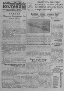 2 З А Б О Л Ы Р Е В И С Т С К И Е К О Я Х О 3 Ы то Аро д мы г Г е е й р с о к й а я С а о в ц т и о а н л о и м с н ти а я ч ес о к б о л г а о с т ь Т . ру Мд а а й Мкопс Г к . аяИв Ман Т о С в , , гд п е олн д о и с р ть е юк подготовилась к уборочной кампании . Н а снимке; Г е р о й С о ц и а л и с т и ч е с к о г о Тру да механик М Т С А . Я Полиниченко (справа) и комбайнер В , И . Дуненкр осматривают отремонтированные комбайны. Определение урожайности — важная государственная задача J T Ü L / V В ответ на заботу об учителе По инициативе председателя Ново-Елизаровского сельсовета т. Л у к а ш о в а , в поселке Л угай, мне учителю школы организовала помощь в п окуп ке доТаа и надворной постройки. Сельский Совет выделил земельный участок для усадьбы и огорода. В ответ на заботу о мне, сельском учителе, я даю обязательство трудиться па посту учителя пока хв ати т моих сил и воспитывать детей в духе любви к - Родине, в д у х е коммунизма. М. И Н О Я Т О В . Н а государственную инспекцию по определению урожайности созда нную по решению февральског о п л е н ум а Ц К В К П ( б ) возложен ы отве тственные за дач и ,— определить урожайность, точно учи т ы к а т ь размеры посевных пл о щадей и сортовых посевов и к о н тролировать выполнение государ с т в е п п ы х заданий по повышению у рож айно сти . Определение у р о ж а й н о с т и проводит исключительно государ ственны й инспектор. В соответствии с постановле. п н е м Совета Министров С С С Р все совхозы, райотделы с е л ь с к о г о хозяй ства организации и у ч реж д е н и я обязаны представлять в распоряжение г о с у д а р с тв е н н о го и н спе кт ора но определению ур ож ай н о ст и в установленные с р о к и необходимые данные и ма териалы по этим вопросам. У р ож а й п о с т ь определяется исходя из фактического урож ая с одного г е к т а р а в момент спелост и той или иной сельскохозяйственной к у л ь т у р ы перед н а ч а лам уборки. Но зерновым к у л ь т ур а м помимо общих посевов урож а й н о ст ь определяется также, и на семенны х у ч а ст к а х . 15 а в г у с т а н а ст у п ае т срок определения урожайности зернов ы х к у л ь т у р от н е с енн ы х к п е р вой г р у п п е . Но решепию правительства на земельные ор ганы и в первую очередь па агрономов районны х отделов сельского хозяй ства и М ТС возложена большая работа. Они обязаны проверить к аж ды й от че т колхоза об урожайности, причем проверить тщательно по с /щ е е т в у . Это возможно лишь при том условии, если агрономы с ель х оз о р га н ов б у д у т часто б ы в а т ь на к о л х о з н ы х " п о л я х , подробно обследовать посевы, хорошо з н а т ь у рож айно сть каждой к у л ь т у р ы . Правительство оказало агрономам большое доверие 15 таком в аж н о м дело к а к п ра ви льное определение урож ай н о ст и в колхо з а х . При проверке к о л х о з н ы х отчетов агропом я в л я е т с я представителем государственной власти. Поэтому он должен помнить прежде в с е г о об интересах государства. Каж ды й факт сниж е н и я урожайности колхозом райотдел сельского х озяй ст в а должен тщательно проверить, разъяснить руководителям колхозов ошибоч пость и х оценки, помочь исправ и т ь ошибки и составить новый отчет. При злостном занижении уро. жайиости виновное в этом должностное лицо должно привлекат ь с я к ответственности. Райотделы сельского х о з я й ст ва, директоры совхозов, управляющие райконторами зАготскот отчеты об урожайности сельскох озяй ственных культур обязаны 