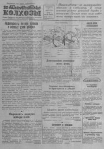 П р о л е т а р и и все х с т р а н, с о е д и н я й т е с ь ! колхозы О р г а н С е в е р н о г о Р К В К П ( б ) и р а й с о в е т а д е п у т а т о в трудящихся Новосибирской облает и А В Г У С Т А 1948 г NS 6 3 (1047) Ц ев а 15 ? э п . Н а ч а л и у б о р к у — не задерживайте обмолот и х л е б о с д а ч у 0 В этом основное условие у сп еш ной борьбы с потерями. Прежде всего надо и з б е жать потерь зерна от осыпания. Кедопускать потерь урожае с первых дней уборки 4 В этом году колхозы н а ш е г о рай о на вы р а с ти л и х орош ий у р о ж а и . Задача со стоит в том, ч то бы бережно, по х о з я й с к и у б р а т ь его не д о п у с т и т ь потерь . К а ж д ы й в ы р ащ енны й колос долж е н б ы т ь своевременно у б р а н с п о л я . С первого ав г у с та начали уборку р ж и кол хо зы «Луч с в е т а » , им. Ворошилова, «Памя ть Ч а п а е в а » , « Красный в а с ю г а н е ц >, им . Сталина, Однако уборка ве> дется только в р у ч н у ю * Не п у щены в работу коппоуборочные м а ш и н ы и к о м б а й н ы . Нельзя за быть , ч то перестой х л е б о в — г л а в н ы й и с т о ч н и к п о терь зерна. Сейчас необходимо, - ч т о б ы в каждом колхо зе р ай о на убирали у р о ж а й всеми средствами уборки. Все с ерпы , к о с ы , к о н п о у б о р о ч н ы е машины и ком- б а й ны д о л ж н ы б ы т ь полностью использованы на у б о р к е , весь световой день. У б о р к а должна б ы т ь ч и с т а я без по тер ь . Если оставил дна кол оса на один к в а д р а т ны й метр, з н а ч и т потерял п у д зерна с г е к та ра . -Необходимо обеспечить подгребание колосьев к о н н ы м и и р у ч н ы м и граблями, собирать колосья и в р у ч н у ю . С к о ш е н н ы й хлеб в р у ч н у ю и к о н н ы м и машинами должен б ы т ь св язан в снопы и сложен в с у с л оны . Запаздывание со с к и р дованием и обмолотом, т а к ж е ведет к большим потерям. По* э т о м у весь хлеб с л о ж е н н ы й в сусл ены должен б ы т ь за с ки рд о ван па 4 - 5 день после косови ц ы , а молотьба должна п рово д и ть с я не поздпее ч е м п а п я т ы й день после начала у б ор ки - Однако р а й о н н ы й отдел сельс к о г о х о з я й с т в а , за вед ующ и й о т делом тов. П ь я н к о в , не к о н к р е т - но .р уково ди т уборкой у р о ж а я . Многие к о л х о зы района з а п а з ды в аю т с началом убор ки у р о ж а я , а на ч а вш и е уборку еще не о р г а н и з у ю т молотьбы, чем з а т я г и в а ю т выполнение плана хлебозаготовок . Н ел ь зя о т в л е к а т ь с я от г л а в ной задачи - хл ебозаготовок . И х падо в ы п о л н я т ь с п ервы х дней уборки у р о ж а я , ибо это первая заповедь колхозов перед г о с у д а р ством.Н о в районном отделе сельс ко го хо з я й с т в а п е т ч е т к и х о п е р а т и в н ы х д а н н ы х . Не знает тов. П ь я н к о в п очему медлят с н а ч а лом у б о р к и к о л х о з ы Ново-Троицк о г о , Прибеливс.кбго и Ч у в а н п ш - с к о г о сельсоветов, и п очему не мол отят к о л х о з ы нача вш и е косо , в и ц у с 1 а в г у с та . Борьба с потерями на убор ке у р о ж а я должна б ы т ь в ц ен тре в н и м а н и я п р а в л е н и й колхозов и рай онн о го отдела сельского хоз я й с т в а Н и к а к о й Пощады бр а ко делам, д о п у с ка ю щ и м потери зе р на* У бр а ть у рож ай без потерь н р п любой п о го д е— дело чести к а ж д о г о к о л х о з н и к а . Б р и га д и р ы п олевод ческих бригад обязаны п р и н и м а т ь убран ны е у ч а с т к и еж едневно , от к о л х о з н и к о в и комбайнеров, а председатель правления от бригадира , после о к о н ч а н и я работ да определенном у ч а с т к е . К а ж д ы й . кил о грамм зерна в з я т ь на с тр о ги й у ч е т . Бди тельно охр а н ят ь у р о ж а й на нол я х и 