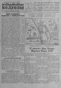 Пролетари и всех стран, соединяйтесь! тШшеСисшснке КОЛХОЗЫ О р га н С е в е р н о г о Р К В К П ( б ) и р а й с о в е т а депутатов трудящихся Н о в о сиб и р с к ой области _____ С У Б Б О Т А 14 А В Г У С Т А 1948 г. № 6 5 (1 0 4 9 ) Дева 15 коп. Все силы сельскога/актит должны быть н а п р а в л е н ы / с е й ч а с на у б о р к у , молот ьбу и х л е б о с д а ч у , чтобы выпоЛш нить и перевыполнить обязательства взятые т р удящ им и ся нашего р а й о н а в соревновании с Куйбыш евским р а й о н о м. Шире развернуть молотьбу и хлебозаготовки 'г ж ра а щй Н . е а н К п о в о л л э я х т х зо о н м н и г а к о ш и д и с у а х м х о к о о о р т л о в х ш е о р з и о ж й в е у н в н р ы о о потрдуились, чтобы с честыо с ди д н е о р й ж и ать т д о а в н а н р о и е щ с е л м ово С п т е а р л е и д н Р ы е м . к ча и с , Н м а д о о с л т р о а ог т л ь и б н ы р с еш то и а л ю х ь л щ ко е и б е о д с е д д н н а ь и , чи у .С п б е о о й р и каждыйчас. Всякое промедление в уборке, обмолоте и хлебосдаче ведет к большим потерям зерна. пил В и се к к у о б л о х р о к з е ы уро р ж ай а о я н . а п О р д и п с а т к у о уборка идет еще медленными темпами. Машинпо - тракторные с с н т м о а о с н т т ц ь р и ю я и н в а е р щ а е б м о е н т д е у ле в нн к к л у о ю ю м чи б л а к и й ос н о ы в п и . о ц Не л у хлебов допущен разрыв между к ш ю е о н в н и ы ц х ейи 14 о 5 б 7 моло г т а ом. -И об з моло с ч к е о н о только 88 га. Лишь 6 колхозов районаприступилик молотьбе и только четыре колхоза «Новый путь», «Вторая пятилетка»,«Со ветская Сибиьр» и им. Карла Маркса приступлии к хлебосдаче. График хлебозаготовок второй пятидпевки августа выполпеп лишь на 6,6 процента. Такого б о п з ы б а о х л т о е о д л ж ь и е н м н н о о и е я с и т с о а е м р е б ж о п е г е е о д с т н н п ь е а в е н ч н о ч ал е е л и а ь у т з м ч я о ь а . л с о т Н т и ь е е каждого колхоза в сдаче хлеба обя государству. вета Колхо (п зы редсе Ф д е а д т о е р л о ь вског с о ель с с е о л в ь е с т о а тов. Гришин) начали косовицу л р к о ж о т л и ьб х е оаз 3 в х с —е эт 4 е о щ го а е в н г с е у е с л п т ь р а с и , о ст в но у е п т и к а ли е . ст м В ь о молотилки, исправные приводы, нет только разворотливости и организованности, чтобы полным ходом, нарядус косовицей хлебов, вести обмолот и хлебосдачу. лоть Н б е у то п р р о е п д и с т ед ся ате о л рг ь ани п зо р в а а в т л ь ен м и о я колхоаз «Луч свет»а тов. Лушов. шН е есм вс о е т х рян п а р т и о с , т ч пу т и о л ко к лх к оз осо р в а и нь ц е, скошено 69 гектар. Но молотьба еще все по организована. в л « а е Л т н у ь К и ч я о с г х в т д л а е о е т б в а . » б Л ? у г д у П о е ш с т р о у е д в д а . м с р о е д с д л о т а о л т в т у ж е и л е т н ь ь к п о о л р и т х а в с о в е д з - ачать за срыв графика второй пятидневки августа, в которую падо было сдать государству 20 т ц н е и а н д в т н е н е р е в с р т к о а у в ть з 3 е 0 рн у а п ц , у ен щ а т не н в н е т р о р е о е в т . ью Ч к т ол о п х б я о з ы «Луч света» обязан сдать на 50 центнеров зерна больше. В прошлом году козхоз им. т 6 ч е а л г л о ь х с т л ъ о е в е . б з о д А с а г д р а ы С ч о з у в к е . о В т в о , в эт , п о е м р п в г р ы о е м д д у се п д о а а н . з п с а т и т в л у яг . е и щ в И е а з е к т 58 с о д бм г а а о ч л е о с т х к л о е и б ш а н е е н г о п г о р о с и уд с у т а р у р о жая в колхозе- им. 6-го съезда Советов обмолочено только пол тора гектара. Хлебозаготовки всегда являлись и являются теперь серьезным экзаменом для колхозного актива. з П о о в это и му п се а л р ь т со ро в г е а т н ов из , ац и и спо к л о к л о х м о ы сельских Советов, пред