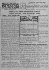 Пролетарии всех стран, соединяйтесь! заМаие&ммжЬе КОЛХОЗЫ О р г а н С е в е р н о г о Р К В К П ( б ) и р а й с о в е т а д е п у т а т о в т р у д я щ и х с я Н о в о с и б и р с к о й о б л а с т и СУББОТА 2 1 А В Г У С Т А 1948 г. № 6 7 (Ю 51) Дега 15 кеш. ТОВАРИЩИ КОМСОМОЛЬЦЫ! Будьте в передовых р я д а х борцов з а досрочное выполнение хлебосдачи госу дар ст в у и сжатые сроки у б о р к и урожаяу вдохновляйте к о л х о з н и к о в и р а б о ч и х МТС на трудовые подвиги! Удвоить иутроить темпы хлебозаготовок в дни декады усиленной хлебосдачи - дело чести каждого колхоза Боевые задачи комсомольцев на уборке и х л ебо заго товк ах 18 августа райком комсомола I 9Эти провел районное комсомольско-мо-1 ляна должны лодежное,радиосовещапие,на кото- 1 ром подведены предвари тельные' итоги участия молодежи в уборке урожая и в хлебозаготовках. Секретарь территориальной комсомольской организации Чу» вашинского сельсовета тов. Мяло сообщил, что до начала хлебоуборки комсомольцы постановлением общего собрания расставили все свои силы на определенные участки,и создали молодежеое зве- ■‘яо вязальщиц за копно-уборочной машиной тов. Петрова. Это звено ежедневно выполняет свое задание па уборке, работает хорошо по качеству. 12 человек молодежи жнут вручную. Комсомолки Плотникова и Степанова ежедневно сжинают по 0 ,20 га при норме 0 ,1 5 га. Вся молодежь села и учащиеся активно ведут борьбу с потерями урожая. Комсомолка Ильина из колхоза «Ееядйц, где секретарем комсомольской организации тов.Фадеев па жатве серпом систематически выполняет норму па 150 процентов. Пополторы нормы в день па жатве вручную, выполняют комсомолки Н-Троицкого сельсовета Петуховы Анна и Елена, Панова Василиса и некоторые другие. Секретарь территориальной комсомольской организации В. Амосова, регулярно проводит громкие читки газет колхозникам. 8 беседах она призывает молодежь к повышению темпов уборки и хлебосдачи. Однако комсомольцы Чувашии- ского и Ново-Троицкого сельсоветов не добились еще решающих успехов в уборке и хлебозаготов ках. Эти сельсоветы являются Отстающими как в уборке так и в хлебозаготовках. Здесь срывается график уборки и хлебосдачи государству. Запаздывание в уборке грозит большими потерями выращенного урожая. Товарищ Сталин учит пас: « У б о р к а , — г о в о р и т о н , — дело с е з о н н о е , и о н а не л ю б и т ж д а т ь . У б р а л во - время — в ы и г р а л , о п о з д а л в у б о р к е — п р о и г р а л * . указания товарища Ста- быть непреложным законом для каждого комбайнера, тракториста, машиниста простых уборочных машин, жнен и вя задьщицы, для каждого колхоз ника работающего в поле. Сейчас на уборке особенно ценны комсомол скал инициатива, напористость и кипучая энергия. Боевая и почетная задача сельских комсомольцев — мобилизовать все силы? всю энергию молодежи па образцовое проведение уборки выращенного урожая и досрочного выполнения плана хлебозаготовок. Самое серьезное внимание должно быть направлено на изыскание еще неиспользованных резервов. Как, за счет каких дополнительных средств ускорить косовицу, обмолот, вывозку хлеба на государственные склады,— вот куда в первую Очередь должны быть направлены инициатива и забот« * комсомольцев, всей сельской молодежи. Для достижения любого yene, ха решающую роль играет личный пример комсомольцев. Комсомолец должен 7?ттик авангарде молодежи на уборке урожа