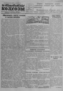 П р о л е т а р и и всех с т р а н, соедин яйтесь ! заШтеЯиапскЬе К О Л ХО ЗЫ О р га н С еве рн о го РК ВКП (б ) и райсовета депутатов трудящихся Н овосибирской области Обеспечить скоту теплую и сытую зимовку Н а п о л я х колхозов н а ш е го р ай о на идет н а п р я ж е н н а я работа по у борке у р о ж а я , у с и л е н н а я борьба за хлеб. Нельзя забы в а ть , что от своевременной уборки у р о ж а я з ависит т а к ж е и дальней шее у к р е п л е н и е живо тнов од ств а . Н а р я д у с уборкой и в ы п о л н е нием плана хл ебозаготовок в кол х о з а х , необходимо обеспечить вы иолне в и е плана заготовок кормов и беспрерывно в ести с троительство н о в ы х и ремонт с т а р ы х с к о т * н и х дворов. Теплая и с ы т а я зимовка для ск о т а должна б ы т ь обеспечена в каждом колхо зе Откладывать это дело до конца у б о р к и , з н а ч и т пр о в а л и т ь подг о т о в к у к зиме. Хорош ий пример то го , к а к го т о в и т ь корма п о к а з ы в а ю т к о л хозы им. К р уп ской , « П ам ят ь К у й . бы ш ева» , им. К а г а н о в и ч а , с Пер- вое м а я » , им. Демьяна Бедного, «Советская Сибир ь» . Эти к о л х о зы в ы п о л н и л и и перевы пол ни ли п л аны сто го ва н и я сена и закладк и силоса. Они обеспечили х о р о шими кормами скот колхозов и весь с ко т л и ч н о го пользования кол хо зни ков . Самотвержепно т р у дились к о л х о з н и к и к борьбе за накопление кормов и добились у с п е х а . . В нашем районе есть ряд кол хозов, к о торы е у с п еш н о за в е р шают под го товк у ж и в о т н о в о д ч е с к и х ферм к зиме. Вот н априм ер , колхоз им. Ворошилова, Б и а з и п - ского сельсовета (председатель т о в .М а к а р о в ) закончил стр о и т е л ь , одно нового те л я т н и к а и новой к о н ю ш н и .Х о р о ш о о тремон ти рова ны все скотные дворы в колхозе и м . Ка!а нонима и в колхозе им. Карла Маркса. Совершенно и н а ч е г о т о в и т с я к зиме колхоз им. К ом и н т е р н а , (председатель прав л ения то в . Т р и б у н а л о в ) Он в ы пол нил пл ан з а г о т о в к и кормив все го л иш ь па 4 4 п р о ц е н та . Земли колхоза им. К оминтерна ра спол ож ены рядом о пол ями колхоза им. К а г а н о в и ча. П о к о с н ы х у г о д и й достаточно и они т а к же рядом и о д и н а к о в о г о качества , Казалось б ы ,р а з о д и н а к о в ы е возможности и условия, д о л ж н а быть и одинакова п о д г о т о в к а к зиме. Но э т о г о не сл уч илось . Заведующий МТФ к ол хо за им. Коминтерна то в . Н а зарова и председатель правде н и я колхоза тов. Т ри б у нал ов , не обеспечили сытой зимовки с к о т у . Они не п р о я в л я ю т заботы в под готовке к зиме с к о т н ы х д во ров. Не обеспечен на зиму с к о т кормами в колхозе «Северная зар я » , О с тя ц к о го сельсовета ( п р е д седатель пр а в л е н и я к ол х о з а тов. Сиваков Н. С .) п л а н сенокошен и я в ы п о л н и в ш и й на 2 5 , 3 п р о ц е н т о в , - и м . Б у д е н н о г о этого же сел ьсов е та ,( пре дсе да тел ь п р а в л е ния колхоза тов.Евдокимов 11 И . ) , з а го т ови вш ий сена 31 процент к п л а н у Не заготовил и половины кормов колхоз «Борьба» , Но- т ю к а н о в с к о г о сельсовета ( п р е д с е датель колхоза тов.Собянин В . М . ) . Б э т и х к о л х о з а х нехватает бол ьшого к о л и ч е с т в а кормов. Однако з а г о т о в к а и х уже прекратилась« П я т а я п а тид й ев к а а в г у с т а совсем не дала прироста в заготовке кормов, несмотря па к о н к р е т н о е ука зани е райкома п а р т и и и р ай исполкома о том, чтобы создать сенокосные бригады и пе отры в а т ь и х на другие работы до вы полнения плана заготовки к о р мов. Бее погол