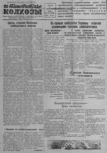 П р о л е т а р и и вс е х с т р а н, с о е д и н яй т е с ь ! тИшие&ижкке КОЛХОЗЫ Орган Северного РК ВКП (б ) и райсовета депутатов трудящихся Новосибирской области 1 94 8 г. № 74 (1058) Цеха 15 коп. / . Принять решительные меры для ежедневного Херевыполнения г р аф и к а тки \ п ~ ^ а я и х л е б о з а г от о в о к и по примеру хлеборобов У к р а и н ы организовать сдачу зерна г о с у д а р с т в у сверх планам Дать стране больше сибирского наела В пятилетием плане наряду е огромной программой восстановления и дальнейшего развития народного хозяйства СССР, наша партия п советское правительство поставили задачу расширения производства товаров широкого потребления п всемерного повышения жизненного у р о в н я трудящихся. В осуществлении этой почетной задачи важнейшее место занимают заготовки молока и масла. Сибирским маслоделам ясно, что без мяса, без масла, без молока нельзя говорить серьёзно об изобилии продуктов в стране, об улучшении материального благополучия нашего народа. Следовательно заготовки молока и масла приобретают в 1948 г. первостепенное значение. Февральский п л е н у м ЦК ВВ1( б ) указал пути решения этой задачи и обязал обеспечить быстрый рост поголовья скота в колхозах, повысить его продуктивность,создать устойчивую кормовую базу, широкую развитую сеть маслозаводов и решительно улучшить дело заготовок животноводческих продуктов. Сейчас наступили решающие дни заготовок молока и выработки масла. Заготовки молока необходимо организовать таким образом, чтобы все хозяйства привлеченные к поставкам, пе выполнившие своих обязательств по плану текущего года и недоимкам прошлых лет ежедневно участвовали в сдаче молока посуда рству. Б социалистическом соревновании трудящихся маслодельной промышленности хороших показателей добились работники Федоровского маслозавода Заведующая Досипским слйвкоотделением тов. Жихарева своей повседневной работой с молокосдатчиками обеспечила выполнение годового плана молокозаготовок по индивидуальному сектору к 10 сентября на 100 процентов. Сейчас многие молокосдатч^ки сдают молоко в госзакуп. Молочно-товарная ферма колхоза «Общий труд», зав. МТФ депутат Федоровского сельсшета тов. Иванникова, к первому августа выполнила годовой план молокозаготовок и продолжает сдачу сверх плана. Хороших показателей добилась заведующая Сургутовского сливкоотделения тов. Веретенникова. Она добилась выполнения плана индивидуальными молокосдатчи- ками. Ряд хозяОств сдают молоко сверх плана. Колхоз «Трудовик», где заведующим МТФ т.«в. Кругляков, выполнил. годовой плап молокозаготовок и продолжает слагать сверх плана. Колхозы Назаровского сельсовета «Красный урмаыец» и «Красное знамя» выполнили планы молокозаготовок и продолжают сдачу молока сверх плана. Сверх плана сдают колхозы им.Кагановича, нм.Карла Маркса и ряд других. Каждый сельский Сокет, каждый колхоз и маслозавод должны полностью выполнить свои обязательства перед государством. Одновременно с завершением плана обязательных поставок- следует усилить работу по заготовкам молока и масла в счет 1949 года. Советские люди понимают важность заготовок молока и охотно продают излишки своих продуктов государству. В порядке закупа у колхозников, государство получило дополнительно многие тысячи тонн масла. Заир играет большую роль в продовольственном балансе с