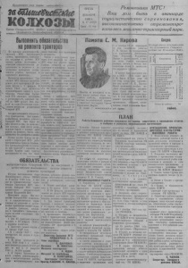 П р о л е т а р и и вс е х с т р а н, с о е д и н я йт е с ь ! шШ№£%исШа&0 К О Л Х О З Ы Орган Северного Р К В К П ( б ) и райсовета д е п у т а т о в трудящихся Новосибирской области Р е м о н т н и к и М Т С ! В а ш долг быть в а ва н га р д е социалистического с о р е в н о в а н и я, высококачест вен но от р ем о н т иро~ ват ь весь м аш и н н о *т р а кт о р ны й парк. СРЕДА i Д Е К А Б Р Я 1 9 4 8 г . № 97 ( 1 0 8 1 ) Цена 15 кип. Выполнить обязательства на решите тракторов По призыву ремонтников Ко- ура некой МТС, Тогучинского района, трактористы, комбайнеры, механики и рабочие МТС нaHiero района включились в областное социалистическое соревнование за досрочное и качественное проведение осенне- зимнего ремонта тракторов и прицепного инвентаря. Коллектив ремонтников ' Тар- тасской МТС обязался закончить ремонт всех тракторов к 23 февраля, плугов к 1 февраля. К началу 1949 года полностью отремонтировать сеялки и культиваторы. Ремонтники Тартас- ской МТС обязались изготовить н реставрировать запасных час теп па 1)000 рублей Они виз вали па социалистическое соревнование коллектив ремонтников Северной МТС. Сегодня печатаются обязательства трактористов, бригадиров, комбайнеров, механиков, рабочих Северной МТС. Они берут на себя обязательства, за выполнение Которых, надо вести решительную борьбу с первых дней работы на ремонте, чтобы обязательства не разошлись с делом. Лучше других бригад ва ремонте в Тартасской МТС работает монтажная бригада Акилина. Его бригада в( чует ила из ремонта три трактора с хорошим качеством. Причем один трактор восстановлен из тех, что были ранее списаны, как пришедшие в негодностьОднако в целомг,ремопт тракторов 4-го квартала но обеим МТС стоит под угрозой срыва. График выпуска из ремонта тракторов и приценных машин, согласно вз ¡тих обязательств, не выполняется. Очевидно директоры МТС, заведующие . ремонтными мастерскими, механики и некоторые ремонтники считают, что впереди еще много времени. Но такой:расчет опасен. Он может вызвать вредную для дела штурмовщину, в ущерб качеству. Сейчас в мастерских МТС должен быть наведен такой порядок, чтобы неуклонно выполнялся график по выпуску из ремонта тракторов. Каждый ремонтник обязан своевременно с хорошим качеством выполнять ежедневное задание. Партийные организации МТС, и в первую очередь заместители директоров по политчасти, должны вовлечь всех ремонтников в индивидуальное социалистическое соревнование, за досрочное проведение ремонта,за перевыполнение ежедневных* норм выр'а ботки. Надо разъяснить каждому трактористу, кузнецу, слесарю какое важное значение имеет досрочное и качественное проведение осенне-зимнего ремонта. Дело Чести всех ремонтников— выполнить взятые обязательства! ОБЯЗАТЕЛЬСТВА механизаторов Северной М Т С за досрочное I качественное выполнение осенне-зимнего ремонта тракторой Обсудив постановление бюро Новосибирского обкома ВКП(б) от 4 ноября 1948 года, и вызов на социалистическое соревнование Тартасской МТС, коллектив Северной МТС, горячо приветствует патриотический призыв Коуракской МТС. Принимаем вызов. Мы коллектив Северной МТС включаемся в социалистическое сорев нование за досрочное и качественное проведение осенне-зимнего ремонта тракторов, комбайнов п прицепного инвентаря и берем на себя следующие обязательства: Е Все 37 тракторов отремонтировать к 23 февраля 1949 г. с х