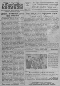 м 2 З А Б О Л Ь Ш Е В И С Т С К И Е К О Л Х О З Ы 12 я н в а р я 1 9 4 § г а д а Ne 4 ( 1 0 9 2 ) АГИТАТОРЫ НА ДЕСЯТИДВОРКАХ Агитаторы Кузьмин П. П , Перцев В. И., Некрасов Н. II., Копытова Е. С., и Голодов И.М., регулярно проводят занятия на своих десятидворках. В условленный с избирателями день, они точно в назначенное время, идут на свои агитпункты проводить занятия. Охвачено занятиями 439 человек. Занятий провели 29. Избирательный пункт уже готов к торжественному дню—30 января. Избиратели активно собираются в клуб, где им кроме «Положения о выборах», агитаторы читают и рассказывают о текущем моменте, о международном положении, и отвечают на интересующие их вопросы. Население Прибелинского сельсовета ожидает знаменательного дня 30 января с радостью и волнением, чтобы выполнить свой почетный долг—отдать голоса за достойнейших людей нашего района, выдвинутых в состав Народного суда. Д . Г Р И Г О Р Ь Е В . Стол спр ав ок на и збирател ьном п у н к т е Чебаковский избирательный пункт раньше других готов ко дню выборов народных судов. Уже приготовлены щиты для кабин, урны. Вывешены списки избирателей. Организован «стол справок»,в котором имеется всякого рода литература имеющ ая ответы на вопросы по выборам в народные суды. ( )рганизовано круглосуток ное дежурство. Дежурят комсомольцы и сельский актив. У справочного стола и м е е т с я з а писная книга, в нее заносятся вопросы избирателе й и ответы на них.Здесь же вывешены краткие характеристики кандидатов в народные судьи и народные заседатели. В . Ф И Л И М О Н О В . ! К о л х о з н о м у с к о т у Т и б е н ь к о в „ м а ч е х а “ Некоторые колхозники все еще недобросове стно о тно с я тся к своим трудовым обязанностям, не жив ут по- настоящему интересами колхоза. К О Р О В Н И Ц А - М А Ч Е Х А —Люблю только мою собственную „ Доч ку “, а до „падчериц" мне дела мало. . . _______ Рис. А. Зубова. Прессклише ТАСС. Уже три месяца как наступил стойловый период для скота, а «горе-хозяева» из колхоза «Единый путь», Остяцкого сельсовета, не сумели обеспечить скот теплой и сытой зимовкой. В телятнике промерзли стены, изнутри они покрыты снегом. Сырость в телятинке недопустимая. Зав. МТФ тов. Тибеньков, не выполняет вете- рипарно-зоотехиических указаний. Имеются случаи заболевания и падеж телят. Отсутствует lia ферме трудовая дисциплина. Зав. МТФ тов Тибеньков сам появляется па ферме от случая к случаю, в силу этого и животноводческая бригада работает плохо. На ферме нет даже суточного запаса кормов. Бывают дни когда скот колхоза получает корм один раз в сутки. Поение скота проводят один раз в день. Поэтому низкие удои молока у дойных коров и общее состояние упитанности скота—пиже среднего Работники животноводства выше поименованного колхоза ни как не могут осознать того, что истощив скот зимой, трудно восстановить ему хорошую упитанность к весне и значит—потерять наибольшие удои молока и снизить доходы колхоза. Скот личного пользования колхозников обеспечен кормами и состояние его упитанности выше среднего. Правление колхоза не контролирует работу и состояние животноводства, упускает из виду дело большой государственной значимости. 3 . К У З Н Е Ц О В А , з о о т е х н и к . Зимнее хранение семян Сейчас в колхозах засыпаются семена на хранение. Неправильно поступают отдельные колхозы, когда многократно пропускают семена через зерноочистительную машину,