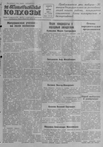 Пролетар и и всех стран, соединяйтесь > заШт&шШие ш т т ш т . О р г а н С е в е р н о г о Р К В К П ( б ) и р а й с о в е т а д е п у т а т о в _______ т р у д я щ и х с я Н о в о с и б и р с к о й о б л а с т и ______ М и ч ур и н с ко е учение на поля к о л х о з о в Доклад академика Т. Д Л ы сенко на августовской сессии Всесоюзной академии с е л ь с к о х о - , ,’ яй ственны х наук им. Л енина ^ « 0 положении в биологической ^ н а у к е » , имеет исключительно V большое значение для да льпейшего развития агрономической н а - ^ у ки и практики соцпалистпче4 ского земледелия. 5 Материалы сессии безусловно о помогут дальнейшему, росту ар4 мии мичуринцев, умножат их л ряды и обеспечат невидапный . рост урожайности полей и про- ^ дуктивности животноводства. На основе мичуринского уче - ния, передовые колхозы и сов- х озы нашей страны, борясь за досрочное выполнение послевоеп- ^ ной сталинской пятилетки, уже ^ 4 добились решающих побед в 5 . о б л а с т и получения высоких и ^ / устойчивых урожаев сельскохо- ^ з яй с т веипы х к ул ь т ур . Если-бы ^ достигнутый передовиками кодхозного производства уровень ^ агротехники, а стало бы ть и уровень урожайности,распространять н а все полевые массивы нашей Р одины— было бы легко достигнуто удвоение и даже у т- ' роение валового сбора зерва в н а ш и х колхоза х и совхозах. Партией и правительством перед социалистическим сельским хозяйст вом, его специалистами и колхозными руководителями сейчас ставится исключительно серьезная задача: в ближайшие годы обеспечить резкое повышение к у л ь т у ры земледелия, чтобы навсегда освободитьс я от всякой зависимости от с т и х и й н ы х сил природы, чтобы снимать высокие и устойчивые у рожай сельскохозяйствеин ых к ул ь т у р при л ю б ы х условиях. Мечта великого ученого И. В. Мичурина о преобразовании природы становится реальной и перестает быть мечтой. И склю чительно большая роль в п р е т ворении мичуринского учения в жизнь принадлежит специалисту сельского хозяй ства,инженеру сельскохозяйственного нро- г изводства— агроному. Отныне, р а бота последнего должна будет оцениваться с позиций: насколько быстро и полно он помогает колхозам осваивать передовую агротехнику и овладевать основами учения великих р у с с к и х патриотов Тимиря зева— М и ч у р и н а — В и л ь я м с а — Д окучаева— Л ы сенко. К сожалению, агрономы и многие руководители колхозов нашего района, до сих н о р н е прониклись в должной мере сознанием з начения мичуринской н а у к и для практики социалистического земледелия и недопустимо вяло применяют выводы и достижения агрономической на ук и » на полях колхозов, Об этом свидетельствуют итоги работы наш и х колхозов за 1 94 8 го д и ряд предшествующих лет, чрезмерно низкая у рожа! оость сельскохозяйственных к у л ь т у р и ни зк ая продуктивность животноводства,об этом-же говорит II ход подготовки к предстоящему весеннему севу. Пора понять,-что без правильной агротехники,; без широкого внедрения мичуринского учения в колхозном полеводстве нельзя даже мечтать о повышении урожайности. Пора отказаться от практики обработки почвы «как-нибудь», от посева плохими но кондиционными семенами. Назрел момент, когда каждый колхоз, должен но-серьезному подумать над введением и освоением правильны х травопольных севооборотов, ко деловому заняться обработкой и удобрением почв, организацией умелого ухода за посевами в пери