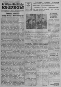 Пролетарии всех стран, соединяйтесь'. шШщиЯиапгние колхозы О р г а н С е в е р н о г о P H В К П ( б ) и р а й с о в е т а д е п у т а т о в т р у д я щ и х с я Н о в о с и б и р с к о й о б л а с т и ___________ Всемерно повышать продуктивность животноводства Зима является решающим периодом в деле выполнения государственного плана развития животноводства и повышения его продуктивности. От того на сколько успешно будет проведена зимовка скота зависит дальнейшее развитие общественного животноводства колхозов. Исходя из указаний областного Совета депутатов трудящихся, исполком районного Совета депутатов трудящихся решил провести в период до 15 мая 1949 года конкурс-соревнование на лучшую организацию зимовки скота в колхозах района. Основные задачи конкурса- соревнования: 100 - процентное сохранение поголовья скота и получаемого приплода; получение высоких привесов молодняка и скота па откорме для сдачи государству, максимальное повышение молочной продуктивности коров. Победителями конкурса-соревнования считаются колхозы и работники животноводства добившиеся следующих показателей в период с 3-го января по 15мая. По привесам молодняка крупно-рогатого скота при полном его сохранении: в возрасте до 4-х месяцев—75О граммов, от 4 - х до 6 месяцев —600 граммов, ет 6 месяцев до года —4 0 0 граммов, старше одного года —300 граммов, в среднем на одну голову в сутки. lío откорму крупно-рогатого скота для сдачи государству,получение среднесуточного привеса на одну голову 550 граммов, при условии откорма поголовья в количестве, обеспечивающем выполнение полугодового задания по сдаче мяса государству и продолжительности откорма не менее 9 0 дней. По откорму свиней для сдачи государству живого веса 80 килограммов,одну голову в среднем, на каждую свиноматку, имевшуюся па начало года. По повышению молочной продуктивности коров, получение удоев молока в среднем на фуражную корову 700 литров, в том числе: в январе —100 л., в феврале — 140 л., в м а р т е - 180 л., в апреле— 180 л., за 15 дней мая 100 литров. В конкурс-соревнование должны быть вовлечены все работники животноводства колхозов и специалисты сельского хозяйства. Первыми включились в выполнение решения исполкома районного Совета депутатов трудящихся, по вопросу проведения конкурса - соревнования среди работников животноводства, Ново-Троицкий, Прибелин- скнй, Биазинский и некоторые другие сельские Советы, которые обсудили этот вопрос па сессиях сельских Советов. В колхозах этих сельсоветов правления совместно с зэоветспециа- листами развернули работу среди членов животноводческих бригад за лучшее проведение зимовки скота и повышение его продуктивности. Животноводческая бригада колхоза им. Кагановича, (председатель колхоза тон. Буглеев,зав. МТФ тов. Ларчепко), включившись в конкурс имеет положительные результаты. Полностью сохранен взрослый с к о т и пародившийся молодняк. За январь получен надой молока па каждую фуражную корову по 112 литров, перевыполнены условия конкурса на 12 литров. 6 колхозе им. Карла Маркса (председатель колхоза тов. Подрядчиков, зав. МТФ т. Егоров), животноводческая бригада которого, включившись в конкурс па4 лучшее проведение зимовки скота, проводя 3 -х кратную дойку коров, кормление их подсолепым сепом и скармливая им силос, добилась, надоя молока за январь месяц от 80 коров в среднем по 110 литров на каждую фу