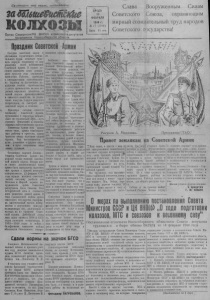 Пролетарии всех empan, соединяйтесь ыШбше&исШШе колхозы О р г а н С е в е р н о г о Р К В К П ( б ) и р а й с о в е т а д е п у т а т о в т р у д я щ и х с я Н о в о с и б и р с к о й о б л а с т и ПразднСиовкетской Армии Сегодня советский народ в обстановке героического созидательного труда отмечает тридцать первую годовщину со дня рождения своей победоносной Советской Армии. В стране успешно выполнен план решающего третьего года сталинской пятилетки. Рабочие, крестьяне и интеллигенция самоотверженно борются з а дальнейшее повышение темпов строительства и роста производства во всех отраслях народного хозяйства, за новый подъем промышленности и сельского хозяйства, за увеличение выпуска товаров широкого потребления, за быстрый рост советской науки и техники. Празднуя сегодня славную годовщину Советской Армии, трудящиеся с гордостью вспоминают ее героический путь—-путь грозных испытаний и знаменательных побед советского оружия. Советская Армия есть армия нового типа, армия освобожденных рабочих и крестьян, армия братства между народами нашей страны. Она воспитывается в духе уважения к другим пародам, в духе сохранения мира между стпанами. Созданная партией Л е н и н а - Сталина Советская Армия—падежный страж великих завоеваний нашего народа. Вскоре после своего возникновения наша армия была вынуждена скрестить свое оружие с армией немецких империалистов. 23 февраля 1918 года отряды молодых советских частей наголову разбили под Исковом и Нарвой хорошо вооруженного врага. Советская республика быда спасена. Этот исторический день и считается днем рождения нашей армии. Б годы гражданской войны армия советского государства выдержала ожесточенный натиск интервентов и внутренних контрреволюционных сил, разгромила и изгнала их из пределов Советской страны. Достойный отпор дала наша армия в 1938 и 1939 годах японским захватчикам. В 1 9 3 9—1940 годах в войне с белофиннами советские войска вбеспечили безопасность северозападных границ советской земли. Особенно ярко проявилась мощь Советской Армии в годы Великой Отечественной войны. Советская Армия доказала, что она самая передовая, первоклассная армия вашего времени. Она сокрушила гигантскую военную машину гитлеровской Германии и ее союзников, вышвырнула немецких захватчиков из пределов своей отчизны, освободила из-под фашистского ярма угнетенные пароды Европы. Победа Советской Армии объясняется тем, что она опиралась па морально политическое единство нашего народа, па индустриализацию страны и_коллекти- внзацию сельсЖго хозяйства. В годы Велакой Отечественной войны миллионы рабочих и служащих, не считаясь ни с какими трудностями и лишениями, самоотверженно, работали на предприятиях, давая фронту все больше и больше танков, противотанковых ружей и орудий, самолетов, пу л е к , минометов, пулеметов, винтовок. Миллионы колхозников и колхозпиц самоотверженно работали на полях и давали фронту и стране все больше и больше хлеба, мяса, а также сырья для промышленности. Душою и мозгом всех побед, одержанных в борьбе против фа- ишетских немецких полчищ, была партия большевиков, вождь советского народа товарищ Сталин. Это наше счастье, что в трудные годы войны нашу армию и советский народ вел вперед мудрый и испытанный вождь Советского Союза великий Сталин.* Советская Армия в условиях мирного времени п