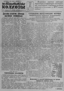 2 2 м а р т а 1 9 4 9 г о д а З А Б О Л Ь Ш Е В И С Т С К И Е К О Л Х О З Ы № 19 ( 1 1 0 7 ) Мероприятия Северного РК ВЛКСМ по участию комсомольцев и молодежи в развитии общественного животноводства и повышения его продуктивности Во всех колхозах провести до 1 0 марта комсомольско-молодежные собрания, на которых обсудить вопрос состояния молочно-товарных ферм. На собраниях определить конкретные обязательства комсомольских организации по развитию животноводства п созданию кормовой базы на 1 9 4 9 -1950 гг. В колхозах, не имеющих комсомольских организаций, провести собрания молодежи. Для проведения собрапий и . оказания практической помощи, послать комсомольский актив. . Провести районный слет молодых передовиков животноводства, с докладом секретаря РК ВКП(б) «Об итогах работы колхозов 7! развитии животноводства и повышения его продуктивности и задачах молодежи на 1949 год». ( Ответственный: РК ВЛКСМ, срок до 15 марта) Развернуть социалистическое соревнование работников животноводства за надой молока не менее 16 цен. на каждую фуражную корову и 100 процентное сохранение молодняка, для чего: а) с наступлением пастбищного периода организовать ночную пастьбу скота и 3-х кратную дойку коров; б) до 1 апреля определить на работу поярками, доярками, скотниками 8 0 комсомольцев; в) в крупных комсомолыжих организациях на животноводческих фермах организовать комсомольские группы; г) до 1 апреля в колхозах им. Тельмана, им. 6-го съезда Советов, им. 7-го съезда Советов, «Парижская коммуна» им. Калинина, создать мичуринские фермы. д) до 15 марта на каждой ферме создать пост комсомольского контроля, который будет следить за правильным учетом и расходованием молока. Для улучшения работы ферм и усиления контроля, на комсомольских собраниях утвердить график круглосуточного дежурства на фермах. ( От в е т . РК ВЛКСМ и с екрет ари к о м с о мо л ь с к и х организаций) . Комсомольским организациям колхозов создать при каждой МТФ прифермский участок по выращиванию высоких урожаев кормовых культур. ( От в е т , с е к р е т а р ь первичной к о м с о мо л ь с к о й организации) . С 20 июня по 20 июля провести комсомольско-молодежный месячник по ремонту и утеплению скотопомещений. Учредить переходящий красный вымпел для лучших комсомольских организаций, занявших первые места в социалистическом соревновании на работах в животноводстве. Для поощрения передовиков вручать благодарности РК ВЛКСМ, с занесением на Доску почета РК комсомола и представлять для награждения в областной комитет комсомола. Итоги соревнования нодводит!, не рейсе 2 раз в месяц. (Отв етств енный: РК ВЛКСМ) . На каждую животноводческую ферму закрепить чтеца-агита- тора, который в основу своей работы должен положить широкое разчжспенпе постановлений партии и правительства но вопросам животноводства, по обмену опытом лучших передовиков и по вопросу текущей политики. Отдле пропаганды,через группу докладчиков,обязан провести ряд лекций о внедрении мичуринской науки в наше животноводство, lí e рейсе одио- го раза в 2 месяца проводить кустовые совещания молодых животповодов но обмену опытом лучших производственников.Материалы широко освещать в районной газете и по радио. Два раза в месяц организовывать молодежные радио-передачи, с освещением в пих участия комсомольцев и молодежи в развитии животноводства. В помощь агитаторам практи
