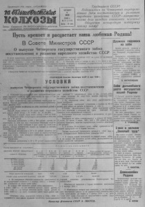 Пролетарии всех ст р ан, соединяйтесь: тШАшеШтайа ш ж ш ш т О р г а н С е в е р н о г о Р К В К П ( б ) и р а й с о в е т а д е п у т а т о в т р у д я щ и х с я Н о в о с и б и р с к о й о б л а с т и Ч Е Т В Е Р Г 5 МАЯ 1 8 4 9 г . J6 38 (1126) Цена 15 коп. Т р у дящ неся С С СР! П одписаться на Четвертый го с у д а р ст венный З а ё м восст а но в лен и я и р а з в и т и я народного х о з я й с т в а С С С Р— п а т р и о т и ческий долг каждого советского человека! Обеспечим всенародную п оддерж ку новому з а й м у ! Пусть крепнет и р а с ц в е т а е т наша любимая Родена! В Совете Министров СССР О выпуске Четвертого государственного займа восстановления и развития народного хозяйства СССР на сумму 20 милиардов В целях привлечения средств населения для выполнения государственного плана восстановления и развития народного хозяйства ССОР—Четвертого года послевоенной пятилетки и досрочного осуществления всего пятилетнего плапа хозяйственного п культурного строительства Совте Министров Союза ССР ПОСТАНОВИЛ: 1.Выпустить Четвертый тесударственный заем восстановления и развития народного хозяйства СССР рублей сроком на 20 лет. 2. Облигации займа и доходы от них, к том числе и выигрыши, освободить от обложения государственными и местными налогами и сборами. 3. Утвердить представленные Министерством финансов 0001 у с л о в и я выпуска Четвертого государственного займа восстановления и развития народного хозяйства СССР. У Т В Е Р Ж Д Е Н О С о в е т о м Ми н и с т р о в СССР 3 м а я 1 8 4 9 г. У С Л О В И Я выпуска Четвертого государственного займа восстановления и развития народного хозяйства СССР 1. Четвертый государственный заём восстановления и развития народного хозяйства СССР выпускается на срок с 1 октября 1949 г. по 1 октября 1969 года. 2. Заём предназначен для размещения толькосреди населения. Порядок размещения займа устанавливаетсяШинистер- ством финансов СССР. 3. Заём делится на разряды по 100 миллионов рублей в каждом разряде. Каждый разряд состоит из 20 тысяч серий. Серии каж- разряда имеют номера с № 00.001 по Л» 8 0 . 0 0 0 . Облигации в каждой серии имеют номера с Л;01 по №50. 4. Облигации займа выпускаются достоинством в 500 ,200 , 50 и 25 рублей. Облигации достоинством в 500 и 200 рублей состоят соответственно из пяти или двух сторублевых облигаций однйо се- рии с пятью или двумя номерами и дают право на 5 или 2 выигрыша, которые одновременно падают на каждый из номеров, обозначенных па облигации. Облигации достоинством в 5 0 "и 25 рублей являются частями сторублевых облигаций и дают право на соответствующую долю (одна вторая, одна четвертая) Выигрыша, выпавшего на сторублевую облигацию. Примечание: дого 1 0 0, Д р у ж н а я п о д п и с к а на займ Дружно проходит подписка в предприятиях и колхозах-района на Четвертый государственный заём. Председатель правления колхоза «Герой» тов. Борисов первым подписался на заём. Его примеру последовали тов. Владимиров И. С., Ильин С. инвалид Отечественной войны и все остальные члены колхоза. Активно прошла подписка среди учителей Северной средней школы, служащих РОМВД и рабочих издательства районной газеты. в. в и г и л я н с к и й . Облигацидиостоинством в 50 я 25 рублей предназначены дующее количество выигрышей: для расчетов С подписчиками лишь в тех случаях, когда по сумме подписки не могут быть выданы облигации более крупного достоинства. 5. По облигациям, займа весь доход выплачивается в фо