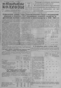 Пролетарии всех стран ссединяйтпсь! зеШ т еФ исШ ВШ КОЛХОЗЫ Орган Северного Р К ВКП(б) и райсовета депутатов трудящихся Новосибирской области ЧЕТВЕРГ 12 МАЯ 1949 г. #40-41(1128-29} Цена 30 коп. Товарищи колхозники, зоотехники и ветеринарные работники\ Всемерно р а з в и в а й т е общественное животноводство, увеличивайт е рост поголовья и повышайте его продуктивностъ! УКАЗ ПРЕЗИДИУМА ВЕРХОВНОГО СОВЕТА СССР 0 присвоении звания Героя Социалистического Труда и награждении орденами и медалями СССР передовиков сельского хозяйства за достижение высоких показателей в животноводстве в 1949— 1951 г. г Учитывая, что рост поголовья скота и повышение его продуктивности является важнейшей задачей в деле подъёма животноводства и в целях поощрения колхозников, работников совхозов и других работников сельского хозяйства за,достижение высоких показателей в животноводстве, Президиум Верховпого Совета СССР постановляет: 1. Установить, что за достижение высоких показателей в развитии животноводства колхозникам, работникам совхозов, МТС, экспериментальных баз научно- исследовательских институтов и опытных станций, председателям колхозов, директорам совхозов, экспериментальных баз и МТС, зоотехникам, ветеринарным работникам колхозов, совхозов, участков и пунктов, председателям исполнительных комитетов районных Советов депутатов трудящихся, секретарям районных комитетов партии, заведующим районными отделами селгсгбго хозяйства, главным зоотехникам, главным ветеринарным врачам и агрономам по кормам районных отделов сельского хозяйства присваивается звание Героя Социалистического Труда или производится награждение их орденами и медалямСиССР. 2. Установить, что присвоение звания Героя Социалистического Труда и награждение орденами и медалями СССР производится председателей колхозов, зоотехников, ветеринарных работников, заведующих фермами колхозов, директоров, зоотехников, ветеринарных работников, управляющих фермами и отделениями совхозов и экспериментальных баз—за перевыполнение годового плана прироста поголовья по каждому виду продуктивного скота и птицы соответственно по колхозу, совхозу и экспериментальной базе в размерах не менее чем на 50 процентов—для присвоения звания Героя Социалистического Труда, не менее чем на 30 процентов—для награждения орденом Ленина, не менее чем на 20 процентов—для награждения орденом Трудового Красного Знамени, не менее чем на 10 процентов-для награждения медалью «За трудовую доблесть» или «За трудовое отличие»щ доярок, скотников-пастухов, телятниц, скотников що выращиванию молодняка, свинарей, чабанов, птичниц, бригадиров животноводческих ферм совхозов и колхозов при условии выполнения годового плана привета поголовья по каждому виду продуктивного скота и птицы соответственно по колхозу, совхозу я экспериментальной базе; и при выполнении одного из следующих показателей по продуктивности животноводства, выращиванию молодняка, откорму и нагулу скота, птицеводству, получению высоких урожаев кормовых культур: 1 . П о надою м о л о к а и п олучения в нем м о лоч ного ж и р а в среднем о т к о ровы за го д (килограммов) Для доярок, скотников-пастухов дойного стада, бригадиров ферм, заведующих фермами и отделениями, зоотехников и ветеринарных работников колхозов, совхозов, экспериментальных баз, председ