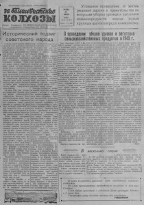 ная оиолиотека. ^ П р о л е т а р и и все х с т р а н, с о е д и н я й т е с ь_! тШбше^итШе К О Л Х О ЗЫ О р г а н С е в е р н о г о Р К В К П ( б ) и р а й с с в е т а щ е п у т а т о в т р у д я щ и х с я Н о в о с и б и р с к о й о б л а с т и Успешное проведение в ж и з н ь решений партии и правительства по вопросам уборки урожая и з а г о т о в о к сельхозпродуктов явится новым крупным шагом вперед к коммунизму. СРЕДА 22 И Ю Н Я 1 S 49 г . & 5 3 ( 1 1 4 1 ) Цена 15 кап Л к > И с т о р и ч е с к и й подвиг с о в е т с к о г о народа В канун второй мировой войны Советский Союз представлял к а р тину огромного подъема всего социалистического хозяйства. Советский народ, руководимый партией Ленина—Сталина, в кратчайший исторический срок создал первоклассную промышленность, оснащенную передовой современной техникой. Появились новые отрасли индустрии, каких совсем не знала старая Россия. Росло и укреплялось социалистическое сельское хозяйство. Величайших успехов достигли просвещение и культура. Все более улучшалось материальное благополучие трудящихся. Советский народ своим мирным созидательным трудом воздвигал на счастье всему человечеству, светлое здание коммунистического общества. 22 июня 1941 года нападение фашистской Германии прервало мирное социалистическое строительство. Началась Великая Отечественная война, явившаяся величайшим испытанием для Советского Союза, самая жестокая и тяжелая из всех войн, когда-либо пережитых н а шей Родиной.Это была не только война между двумя армиями,но и война всего советского народа против немецко-фашистских войск. Война явилась всесторонней проверкой материальных и духовных сил советского народа, проверкой прочности и могущества советского строя. Многонациональное ■советское государство оказалось крепким и несокрушимым при всех тяжких испытаниях. Партия большевиков подняла Советскую Армию и всех трудящихся на отпор врагу. Народы Советского Союза еще более сплотились в борьбе за независимость и честь своей Родины, показали величайшую стойкость, единство и организованность. Великий Сталин встал во главе обороны Советского государства. Наша страна превратилась в единый лагерь. Фашистское правительство Германии полагало, что Советская Армия будет быстро разгромлена, и это приведет к уничтожению Советского государства. Реакционные круги США и Великобритании сознательно затягивали открытие второго фронта, рассчитывая, что Советский Союз истощит свои силы в длительной борьбе один на один. Фашистская Германия и ее тайные и явные друзья из лагеря англо-американской реакции просчитались в своих надеждах на поражение Советского Сою^. Советское государство не только выстояло в этой борьбе, но, наращивая свою мощь, сокрушило немецко-фашистских зах ватчиков и принесло свободу народам Европы. 2 мая над Берлином взвилось знамя нашей победы над гитлеровской Германией. 8 мая 1945 года фашистская Германия безоговорочно капитулировала. Победил советский общественный н государственный строй, армия великой социалистической державы. Прозорливое руководство большевистской партии и вождя народов товарища Сталина, пламенный патриотизм советских людей, нерушимое морально-политическое единство советского народа, дружба народов СССР,— источники нашей победы. Советское государство вышло из великой битвы еще более окрепшим и могучим. В то время как 