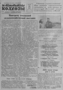 П р о л е т а р и и в с е х с т р а н , с о е д и н я й т е с ь! шШтеШтснке колхозы О р г а н С е в е р н о г о Р К В К П ( б ) и р а й с о в е т а д е п у т а т о в т р у д я щ и х с я Н о в о с и б и р с к о й о б л а с т и Р а б от н ик и сельского х о з я й с т в а ! Ш и р е развернем социалистическое соревнование за право у ч а с т и я на предстоящей Всесоюзной сельскохозяйственной выставке в Москве\ СУ Б БО Т А 25 ИЮНЯ 1949 г. Я 54 ( 1 1 4 2 ) Цена 15 коп. Н ав стр е ч у всесоюзной сельскохозяйственной вы ставк е > Сегодня в наш ей га зе те п у б л и к у ю т с я показатели для отбора у ч а ст н и к о в Всесоюзной сельскохоз яй ственной в ыстав к и 1 9 5 0 года по Новосибирской области, предусмотренные постановлением Комитета в ы с т а в к и и утв е рж ден ны е Советом М ини стров Союза СССР . В довоенные годы широко развернувшееся соревнование за право участия в выставке спо собствовало подъёму сельского хозяй ства. 1 а в г у с т а 1 93 9 года, открывая в ы с т а в к у , тов. Молотов сказал: «Всесоюзная се л ь с к о х о зяйственная выставка, почин организации которой принадлежал Второму Всесоюзному с ъ е з ду к олхозн иков -ударников в 1 9 3 5 г о д у ,— это прежде всего в ы с т а в к а колхозов, в ы с е в к а 5 к о л х о з н ы х побед, в к о то ры х мы видим всепобеждающую силу союза рабочих и крестьян^ под знаменем коммунизма , ч Щ з н а менем великой партия Л е н и н а — - Сталина». Н а в ы с т ав к е широко была представлена и Новосибирская ООЛаС'ГЬ. В ПсшыЛьипо' »Спииро» ' демонстрировались её большие у сп е хи в полеводстве и животноводстве. Указом Президиума Верховного Совета Сонка С С Р за видающиеся у с п е х и в подъёме сельского хозяй ства и за перевы полнение показателей В С Х В К у - пинская машиннотракторная с т а н ц и я была награждена орденом Трудово го Красного Знамени . Л у ч ш и м колхозам и совхозам области комитетом выставки б ы ли присуждены 9 "дипломов п е р вой степени и 3 6 — второй. Дев я т ь передовиков сельского х о зяйства награждены большой з о лотой медалью и двадцать— м а лой золотой медалью. Большие и малые серебряные медали п о л у чили 311 человек. В сесоюзная сельскохозяйствен пая в ы с т а в к а продолжалась в течение 1 9 3 9 и 1 9 4 0 годов. Война, на вя занна я нашей стране гитлеровской Германией, п рервала её работу. После победы над Германией быстрыми темпами стало восстанавливаться народное хо зяй ство С С С Р . Вы полняя историческое решение февральского Пленума Ц К В К П ( б ) , труж еник и к о л х о з ной деревни за короткий срок добились замечательных успехов. В целях п ок а за ' и распространения л у ч ш и х достижений социали стического сельского хозяйства в послевоенные годы февральский П л е н у м Ц К ВКП (б)реншл возобнов и ть работу Всесоюзной с ель с к о х озяй ств енной выставки с 1 95 0 года. Совет Мини стров Союза С С Р установил для представленных на В С Х В х озяй ст в и районов за получение в ы с о к и х , устойчивых урожаев и вы с о к ую продуктивность животноводства, за внедрение передового агротехнического комплекса, за введение многоотраслевого высокопродуктивного хозяйства, а т а к ж е за получение д р у г и х практически важных результатов следующие виды н а град: две т ы с я ч и дипломов пе р вой степени и пять тысяч дипломов второй степени. Участник» к и в ы с т а в к и , награждённые д и пломами первой степени, одновременно получают пр емию— л е г ковой или грузовой автомобиль, награждённые •> дипломом второй с т е