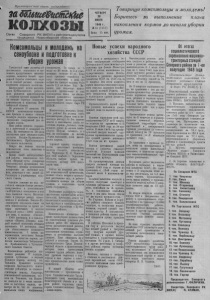 Пролетарии всех стран, соединяйтесь! ЗйЩте8истскЫ КОЛХОЗЫ Орган Северного Р К ВКП(б) и райсовета депутатов трудящихся Новосибирской области ЧЕТВЕРГ 28 ИЮЛЯ 1949 г . & 63 ( 1 1 5 1 ) Ц ена 15 коп. Товарищи комсомольцы и м о л од еж ь ! Борит есь за выполнение плана накоплены я кормов д о начала уборки урожая. Комсомольцы сеноуборке и уборке Т р е х л е т и й план развития общественного колхозного и совхозного продуктивного животноводства, является боевой прог- I рамкой борьбы советского народа за полный расцвет социалистического сельского хозяйства. Благородный почин животноводов Куйбышевского района в деле развития животноводства и создания прочной кормовой базы находит горячую поддержку комсомольцев и молодёжи Новосибирской области. По решению I V пленума Р К В Л КСМ Комсомольске»-молодеж- ор вые бригады и звенья оказали большую помощь колхозам в организации сооружений для за кладки силоса. Наш район неплохо справился с заготовкой и закладкой силоса. По состоянию на 2 0 июля выполнили план закладки силоса колхозы Больше-Куликовского, Чебаковского, Прибелинского и О с т я ц ко го сельсоветов. К а к ую же помощь оказали комсомольцы этим колхозам и сельсоветам ? » Кроме своей непосредственной работы, комсомольцы кол хоза «Верный путь» (секретарь комсомольской организации тов. Ч е ш у н а с ) дважды организовали воскресник по заготовке кормов, вовлекая в них людей раб о та ю щ и х в учреждениях сельс к о г о Совета. Большое влияние на ход за готовок оказали«боевые ли стки», вы п у с ка емы е в животноводческой бригаде,с освещением в н и х хода закладки силоса. В к л ю ч и в ш и с ь в ударную декаду комсомольцы п молодежь Б о л ьш е -К у ликовского сельсовета взяли на себя обязательства за время декады застоговать в колхозе «Верный путь» — 1 0 0 0 центнеров сена, в колхозе « Ги га н т » — 1 5 0 0 центнеров, а в сельхозартели «Памя ть Ленина» к а ж дый молодой колхозник обязался заготовить 50 центнеров сена ' для общественного колхозного животноводства. С таким же стремлением, заготовить больше и лучшего качества кормов, р а ботали комсомольцы Чебаковского, Прибелинского и Ч у в а ш и н - ского сельских Советов. Комсомольцы райцентра в ы полняя решение I V пленума, провели субботник и оказали большую помощь колхо зу им. Тельмана. Правление колхоза выразило благодарность комсомольцам райцентра за социалистическую помощь. Секретарь комсомольской организации, колхоза им. Тельмана, тов. В а щ е н ко оказался не в числе а к т и в и стов но заготовке кормов, н е смотря на то, что он является звеньевым звена машинистов имолодежь на подготовке к урожая сенокосилок. За время от 5 июля по 20 июля, па 3 - х сенокосилках скошено 29 га. Если взять среднюю выработку на одну сенокосилку в день это выйдет на каждую машину 0,(54 вместо 3 , 5 но норме. Тов. В а щенко, к а к секретарь комсомольской организации и к а к руководитель звена, не обеспечивший выполнения планового задания будет нести серьезную ответственность перед бюро Р К В Л КСМ . Комсомольцы, молодежь Северного района! Вы должны стать инициаторами уборки сена в н е настную п о г о д у ! 'О т Вас зависит многое в выполнении плана з а готовки кормов. Осталось очень немного время до начала хлебоуборки. Нел ь з я забывать и о ней, но необходимо до начала уборки выполнить план накопления кормов. Хороший пример сознательности показывает комбайнер ко