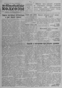 П ро л ет а р и и всех стран, соединяйтесь! заШт&исййШ КОЛХОЗЫ Орган Северного РК ВКП(б) и райсовета депутатов трудящихся Новосибирской области Задана партийных организации вдни уборки урожае работе но руководству уборкой и Колхозы и М ТС н аш е го р а й она в с т у п и л и в самый ответст в е н н ы й период с е ль скохо зя йс т в е н н ы х работ. К о л х о з н и к и и колх озницы много сделали для того, чтобы вырастить хороший у р о ж а й . Уборка у р о ж а я н а ч а лась. Районная п а р ти йн ая о р г а низация д е р жи т серьезйый э к замен перед партией и пр а в и т е л ь ством. Своевременная уборКа в ы ращенного у р о ж а я , выполнение государственного плана хлебозаг о т ов о к каждым колхозом имеют в ажнейш ее х о з я й с т в е н н о - п о л и т и ч е с к о е значение для наш ей с тра ны , для дальнейшего п о в ы ш ения материального и к у л ь т урного у р овня советского парода. В настоящее время все силы района должны бы ть направлены к тому, чтобы па п р а к т и к е о с у щ е с тви ть постановление Совета Ми н и стр ов СССР и Ц К ВК1Ц6) «О проведении уб орки урожая и заготовок се ль с кох о зя йс тв ен ны х п род у к то в в 1 9 4 9 г . » . Это— боевая программа работы каждой п ар тор гани зац ии на селе, к а ж дого комм у ни ста . П а р ти й ны е ор г а н и з а ц и и должны расставчть. коммунистов н а решающие у ч а с т к и работы, добиться т а к о г о положения, при котором все к о м м у н и с т ы сл у ж и л и -б ы образцом в бо рь б е 'з а своевременн у ю у б о р к у урожая и досрочное выполнение плана хлебозаготовок , были бы п одлинны ми в о ж а к а м и и ор ганизаторам!! к о л х о з н ы х масс на у б о р к у в с ж а тые с р о к и и в ы п о л н е ние плана хлебозаготовок. Однако не все ещё к о м м у н и с ты ко л х о з ны х п а р т о р г а н и з а ц и й п о -н а с т о я щ е м у мобилизуют к о л х о з н и к о в на решение этой в а ж н е йш е й задачи , не я в л яю т с я примером среди к о л х о з н и к о в . П а р т о р г а н и з а ц и я ко л х о з а им. К а л и н и н а (с е кр е т а р ь тов. Л у - п е к о ) со вершенно перестала и н тересоваться положением дел в колхозе. Её к о м м у н и с т ы зан и маются ли ч н ы м и делами. Среди к о л х о з н и к о в не проводится массо в о -п о л и ти ч е с к а я работа и в ре зульта те о ч е н ь слабая трудо вая ди с ц и п л и н а в колх о зе . К ол хоз до сих пор не з а к о н ч и л з а г о т о в к у кормов для с к о т а . Не имеет рабочего плана н а п е р и од у б о р о ч ны х работ и хлебозаг о т о в о к , К уборке у р о ж а я не п р и с т у п и л и , хо тя площади для у б о р к и и м е ю т с я . Территориальные п а р т о р г а н и з а ци и и и х .к о м м у н и с т ы , несут всю полноту ответственности за положение дел в т ех колх о зах , где н е т к о л х о з н ы х п е р в и ч н ы х п а р т и й н ы х о р г а н и з а ц и й . П а р тийные организации обязаны подска зы в а ть правлениям к о л х о зов к а к п а х о д и ть выход из з а трудн и те льно го п оло же ни я , о к а - «ывать п р а к т и ч е с к у ю помощь в хлеоозаго товкам и. Особое внимапие должно бы ть уделено ор ганизации с о ци ал и с ти ч е с ко г о соревнования среди к о л х о з н и к о в , трактористов, к ом б ай н е р о в , специалистов се льского х о з я й с т в а . Социалистическое с о ревнование является важнейш им ры ч а г о м всех н а ш и х усп е хов Надо со здать условия т р у дящимс я для выполнения своих обязательств данных в письме т о в а р и щ у Сталину. Дол г к а ж д о г о к о м м у н и с т а — быть в п е р в ы х рядах со ревнующихся . Па р ти й ные о р г а н и з а ц и и долж н ы ш и р
