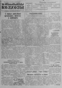 П р о л е т а р и и всех ст ран , с о е д и н я йт есь! . 2аШте&шжКке КОЛХОЗЫ О р г а н С е в е р н о г о Р К В К П ( б ) и р а й с о в е т а д е п у т а т о в т р у д я щ и х с я Н о в о с и б и р с к о й о б л а с т и ! В О С К Р Е С Е Н Ь Е *4 ' ■ А В Г У С Т А 1949 г . Х £ 8 ( 1 1 5 6 ) Дона 13 son. Товарищи к о л х о з н и к и ! Организуйте молотьбу в каждом к о л хо з е ! Н е скапливайт е з е р н о на т о к а х, ежедневно у ч а с т в у й т е в хлебозаготовках\ С перывх дней уборки организовать молотьбу и хлебосдачу Все колхозы нашего района вступили в уборку урожая озимой ржи. Уборку ведут серпами, косами,конео-у борочными машинами и комбайнами. В колхозе «Ударник» работают на уборке конно-уборочные машины и 120 человек жнут рожь вручную. В сельхозартели им. Калинина вышли на уборку все колхозники. Хлеб—это богатство я могущество нашей Родины. Поэтому надо с первых дней уборки урожая развернуть хлебозаготовки. Задача партийных организаций, сельских Советов, председателей правлений колхозов и колхозного актива широко разъяснять и ежедневно применять на практике указания товарища Сталина: « . . . Не о т в л е к а й т е с ь о т г л а в н о й з а д а ч и , р а з в е р н и т е х л е б о з а г о т о в к и с п е р вых ж е д н е й у б о р к и и фор с и р у й т е и х , ибо п е р в а я з а п о в е д ь - в ы п о л н е н и е п л а н а х л е б о з а г о т о в о к » . . . Успех хлебозаготовок во многом будет зависеть от правильной организации молотьбы, работы комбайнов и сушилок, а так же от своевременной очистки зерна, перевозки его на пункты «Заготзерно». Первым в нашем районе приступил к выполнению своих обязательств перед государством по хлебозаготовкам колхоз «Вторая пятилетка», Верх-Красноярского сельсовета. Он сдал государству 50 пудов хорошей ржи. Вслед за колхозом «Вторая пятилетка» приступили к выполнению первой заповеди перед государством колхозы «Советская Сибирь», «Красный Октябрь», «Правда». Обком ВКИ(б) 14 августа проводит воскресник массовой хлебосдачи. В этот воскресник должны включиться все колхозы нашего района. Наряду с высокопроизводительной работой на уборке вручную и конноуборочных машин, надо»обеспечить бесперебойную работу всех комбайнов и молотилок. В каждом колхозе необходимо организовать круглосуточную подработку и сушку зерна. Дело чести членов каждого колхоза выполнить задание хлебозаготовок как в день воскресника, так и в дальнейшем, не допускать срыва графика до полного выполнения государственного плана. Т о в а р и щ и к о л х г . мн и ! Не допускайте опмбок прошлых лет. В ряде колхозов нашего района в прошлом году скошенный хлеб во-время не обмолачивался, а очистка к просушка намолоченного зерна и сдача его государств; задерживались. Строго выполняйте график хлебосдачи. График—это закон. Помните, что успех передовых колхозов на хлебозаготовках тем и объясняется, что они начинают вывозку хлеба с первых днейг>уборки и ведут ее ежедневно по графику до полного выполнения плана. Должной- работой па уборке и хлебозаготовках обеспечим досрочный рассчет с государством, выполним обязательства, данные великому Сталину! ------------- И ---------- — ОБЯЗАТЕЛЬСТВА к ом бай неро в Северной МТС на время уборки у р о ж а я Мы, комбайнеры Северной МТС, включаемся в социалистическое соревнование на период уборки зерновых в 1949 году и берем на себя следующие обязательства: 1. Выполнить государственный план комбайновой уборки в 20 календарны