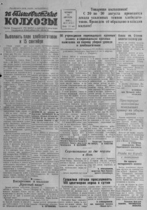 9 * I f r I £ к * J П р о л ет а р и и всег стран, с оединяйтесь! ш Ш ш а/иеЯ Ш 1е К О Л Х О З Ы Орган Северного Р К ВКП(б) и райсовета депутатов — трудящихся Новосибирской области Ч Е Т В Е Р Г 1 3 А В Г У С Т А Î B 4 9 г . № G9 ( 1 1 5 7 ) Цена 1 5 коп. Т о в а р и щ и к о л х о з н и к и ! С 2 0 по 3 0 а в г у с т а проводится д е к а д а ус ил енны х темпов х л е б о з а г о т о в о к . Проведем её образцово в к а ж д о м кол хо зе ! Выполнить план хлебозаготовок к 15 сентября Уборка озимой р ж и в к о л х о з а х района з ав ерш ае тс я . Колхоз им. Сталина (председатель т Фролов), 17 а в г у с т а з а кон ч и л у б о р к у р ж и . Все силы п е р е к л ю чены н а обмолот и в ы в о з к у з е р на г ос у д арс тв у . Постановление Совета М и н и стров и Ц К В К П ( б ) «О проведен и и у б о р к и у р о ж а я и з а г о т о в к а х се ль скохо зя йс тв ен ны х п р о д у к то в в 1 9 4 9 года», у к а зы в ае т руководителям с е ль ски х Советов п председателям колхозов на н е обходимость с очетания всех убор о ч н ы х работ с з а го тов кам и се льхозпродуктов. Правильно пост упили т а к и е колх озы , к а к « В т о р а я п я ти л е т ка» (председатель т. О с и п о в ) . « К р а с ный Октябрь» (председатель т. Тр и б у н а л о в ) , «Правда» (п редседатель Степанов), ко торы е , вслед за у б о р к о й , ор ганизовали молотьбу и х л е б о с д а ч у . К о л х о з н и к и э т и х колхозов вып олн яю т п ервую заповедь перед г ос у д ар ством и свои об язательства,данные в письме т о в а р и щ у Сталину. Наряду с положительными п р и мерами ряда колхозов района, н а у ч и с ь и т а к и е , которые, имея намолоченное зерно, держа т его у себя на т о к а х , серьёзно не дум а я о з е р н о п о с т а в к а х г о с у д а р ству. Решением бюро Р К В К П ( б ) и Ра йисполкома от 15 ав густа т е к у щ е г о года отмечены р у к о в о дители В и а зи н е ко го , Останинско- г о , Ос тяц ко го и Северного сель советов, к а к не п о н я в ш и е свои х задач и п о т ерявш ие чу в с тв о ответственности. Достоен ос уждения т а к о й ф а к т : колхозы Северного сельсовета на день в о с к р е с н и ка уси л енн ой х л е босдачи имели намолоченно го з е р н а 5 0 0 центнеров, но из н и х только 6 центнеров сдали г о с у д а р с т в у . Колх озы Б и а зи н с к о г о сельсовета в этот день сдали о к о ло 2 - х центнеров, х о т я у б р а н н а я площадь р ж и п р е в ы ш а е т 2 0 0 г е к т а р о в . Б ю р о Р К В К П ( б ) и ра йи сп ол ко м осудили та к о е беспечное отношение к в аж не йш им обязанностям ру ководителей сельсоветов и колх о зов и у к а з а л и па необходимость безусловного в ы п о л н ен и я а в г у с т о в с к о г о задания хлебопос тавок к 1 с е нтя бря . Для у с п е ш н о г о ведения х л е бопоставок г о с у д а р с тв у н у ж н о , в п е рв ую очередь, хорошая о р г а н и з а ц и я труда в к о л х о з а х . Н е менее в а ж н о , ор ганизовать о ч и с т к у и п р о с у ш к у з ерн а , не д оп у с кая большого с к а п л и в а н и я его на т о к а х , и постоянно работающую т р а н с п о р т н у ю бригаду , обеспеч е н н у ю хорошими бричками или т ел е га м и , мешкотарой и т я гло м . П а р ти я и правительство треб у ю т от п а р т и й н ы х и сове тских о р г а н и з а ц и й повседневного р у к о водства к а ж д ы м , колхозом и уде- л еп и я особого внимания на подт я г и в а н и е о т с т аю щ и х . В районе имеется много о т л и ч н ы х работников сельского х о з я й с т в а , к а к Бр ицева А н на из колхоза' «Красный нацмен» , Сидорова Дарья из колхоза «Еди н ы й п у т ь » , комсомольские б р и гады молодых хлеборобов,звенья в я за льщ и ц и многие д р у г и е р а б о 