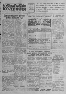 Пролетарии всех стран, соединяйтесь! ы Ш т е&иат кЫ КОЛХОЗЫ О р г а н С е в е р н о г о Р К В К П ( б ) и р а й с о в е т а д е п у т а т о в — т р у д я щи х с я Н о в о с и б и р с к о й о б л а с т и ВО СКРЕСЕНЬЕ 21 А В Г У С Т А ÎS4B г . Л 70 11158) Цена 15 soir. В д н и д е к а д н и к а —с 2 0 яго д о 3 0 - ю августа — каждый к о л х о з нашего района должен сдат ь г о с у д а р с т в у не Л4енее 6 0 проц* годового плана х л е бо за гот о в о к ! Обеспиемчвысокий урожаи озимых будущего года 5 первый день декадннна колхоз „Советская Сибирь" сдал государству 400 пудов р»нн. МШШЯДОСКЖ по П о п р е д с т а в л е н и ю п е р в и ч н ы х п а р т и й н ы х о р г а н и з а ц и й и и с п о л к о м о в с е л ь с к и х С о в е т о в на р а й о н н у ю Д о с к у П о ч е т а з а н о с я т с я п е р е д о в и к и х л е б о у б о р к и : 1. Е р м о ш к и н а П. В . —жнея колхоза полняющая 3 нор*!ы в день серном на уборке ози « м У о к й ра р и ж н и е . ц», вы2. К а р т о в е н к о П. н щ о а р я ме з . а день до 0,38 га — гус ж т н о ея й р к ж о и лх , оза вм « е Л ст у о ч св 0 е ,1 т 2 а», га сжи но наю3. Б о р о в с к и х Ф . Н . —жнея колхоза «2-ая пятилетка», за день вырабатывающая боле 250 процентов нормы. 4 . Д у д и н а М . З . — нающая 0,34 га, вместо 0,15 п ж о не н я орм к е о . лхоза им. Крупской, сжи5. П р о хо р о ва А н а с т а с и я—жнея колхоза нм. Крупской, дающая 3 нормы в день на жатве серном. 6 . Ш а к м а н о в а С. —жнея колхоза «Красный нацмен», пожилая колхозница, выполняющая дневное, задание па жатве на 200 процентов. 7 . Д м и т р и е в Н . Ф . — ш 2, и 5 н 0 ы г к а ол п х о оз н а ор « м Л е у — ч 3,1 с 5 вет г а а » . , м у а б ш и и ра н ю и щ ст ий пр з о а стой ден у ь, бор в о м ч е н с о т й о ма „Об итогах социалистического соревнования машинно-тракторных станций, сельских Советов и колхозов райноа на уборке урожая и хлебозаготовках по состоянию на 20 августа“ . (Постановление исполнительного комитета Северного районного Совета депутатов т р у д я щ и х с я и бюро райкома В К П (б) с. Северное 20 августа 1919 года). Наступил самый напряженный, самый ответственный период л се и л в ь а с я ко с хозя к й а с ж тв д е ы н м ного дн го е д м а.У те си м пы уборки п хлебосдачи, колхозы приступили к севу озимых иод урожай будущего года. Все 'эти работы имеют одинаковвоажное з в ш н и е а й т че и н с я и тр е с а е н л ы ь в с . к д о е г л о е ус х п о е з ш яй н с о т г в о а ра н з а ные Колх ст оз а ы нци и и м н аш аш и е н г н о о-тра р к а т й о о р н а имеют полную возможность производить однорвеменно с уборкой урожая и сев озимых. Нужна только большевистская организованность, правильная расстановка сил и средств. В это горячее время каждый ч в е а л т о ь век об в ще к ст о в л е х н о н зе ом д у олж х е о н зяй о с т т д в а у всю свою энергию. В этом году колхозы нашего ж ра а й й о ,н н е а же в л ы и ра в сти п л р и еды л д у у ч щ ш и и е й го ур ды о, по на этом ваться и н на ел до ьзя д ос о т б а и н т а ь в с л я и в 1950 готу еще более высокого у ч р и о т Р е ж е л а ш ь я н е . о н й ие м э е т р о е й , з з а а в д и а с ч и и т , в от у зн сав п а е . шн и о б г о о оз п и р м ов а е я ден р и о я жь озим я о в го ляе с т е с я ведущей культурой в нашем с р о а к й и С о е е н в е и , о о з у и н с а м то ы д й х а ч ё и т н в а ы ч е н ат аиб у к р о о о л л ж е х а о е и з . а в м ы и Больше-Куликовского, Верх- Красноярского, Гражданцевско- го, Биазинского, Остяцкого и Мало-Карагаевского сельских Советов, и колхозом «Советская Сибирь» Северного сельсовета. Наиболее успешно сев озимых проходитв колюзе «Верный п ш у о ть о » б . р