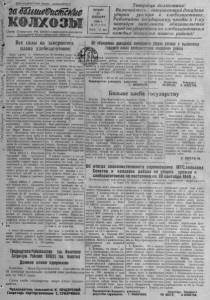 *П р о л е т а р и и всех с т р а н , с о е д и н я й т е с ь! мМте®ис/псШ КОЛХОЗЫ Орган Северного РК ВКП(б) и райсовета депутатов трудящихся Новосибирской области Ч ЕТВ Е Р Г 22 С Е Н ТЯБРЯ 1949 г . & 79 (1167) Цена 15 кои. Товарищи колхозники! Включайтесь завершающий декадник у б о р к и у р о жа я и х л е б о з а г о т о в о к. Работайте подударному, чтобы к 1-му октября выполнить обязательства перед государством по хл ебо за гот о вк ам каждым колхо: ом нашего района! Все силы на завершение плана хлебозаготовок Наша партия и советское правительство всегда уделяют особое внимание хлебозаготовкам. Хлеб—это богатство и могущество нашей Родины. Чем больше хлеба в закромах нашего государства, тем лучше благосостояние всех трудящихся. Поэтому колхозники, рабочие МТС и специалисты сельского хозяйства нашего района брали обязательства—провести уборку урожая без потерь, досрочно выполнить государственный план хлебозаготовок каждым колхозом. С честью выполняют взятые на себя социалистические обязательства колхозники ряда колхозов вашего района. Члены сельхозартели «Вторая пятилетка» первыми в районе выполнили план хлебозаготовок. Они сверх плана сдали больше тысячи пятьсот пудовзерна государству и продолжают сдачу. Выполнен план хлебозаготовок колхозами им. Карла Марксаи «Новый путь». Колхозники этих колхозов продолжают сдачу хлеба государству сверх плана. Колхозы Верх-Красноярского сельсовета в целомпо сельсовету выполнили годовой план хлебозаготовок на 103 процента. Обком ВКН(б) и облисполком призывали всех трудящихся сельского хозяйства закончить выполнение годовогоплана хлебозаготовок к 20 сентября. Однако большая часть колхозов нашего района не справилась с поставленной задачей, не закончили план уборки и хлебозаготовок. Райком ВКП(б) и райисполком подвели итоги социалистического соревнования среди колхозов, сельсоветов и МТС, по состоянию на 20 сентября, и считают ход хлебозаготовок в районе крайне неудовлетворительным. Наш район имеет все возможности быть в числе передовых районов области по уборке и хлебозаготовкам, но далеко отстает от соседних районов Венгеровского и Кыштовского, занявших второе и третье места в областном соревновании районов. С целью быстрейшего устранения недостатков и усиления темпов уборки урожая и хлебозаготовок райисполком и Райком ВКЩб) объявили с 2 0 ио 30 сентября декаду пор шению плана уборк* и хле готовок всеми колхозами на. Главная задача сейчас состой ит з том, чтобы резко поднять темпы косовицы, обмолота, просушки и очитски зе] .-а и сдачи его государству. 1 примпримо бороться против т< . кто не проявляет заботы о сохранении урожаи и нарушает график хлебосдачи. Неоперативность председателей колхозов в оргатизан/ л обмолота, просушки и ис:;.и зерна стала тормозом ’ебозагого- вок в ряде колхозов Прибелнп- ского, Чувашинского и Потогка- новского сельсоветов. Председатели отстающих ко/лозов свою бездеятельность в >тебозаготов- ках стараются прикрыть ссылками на непогоду. 1 Надо решительно разоблачать подобные ссылки и предъявлять большевистскую требовательность к председателям колхозов и бригадирам, чтобы интересы государства были I ревыше всего и соблюдались в первую очередь. Погодные условия одинаковые для всех колхозов, поэтому скрываться за ними никому не следует. В каждом колхозе, в эти завершающие д